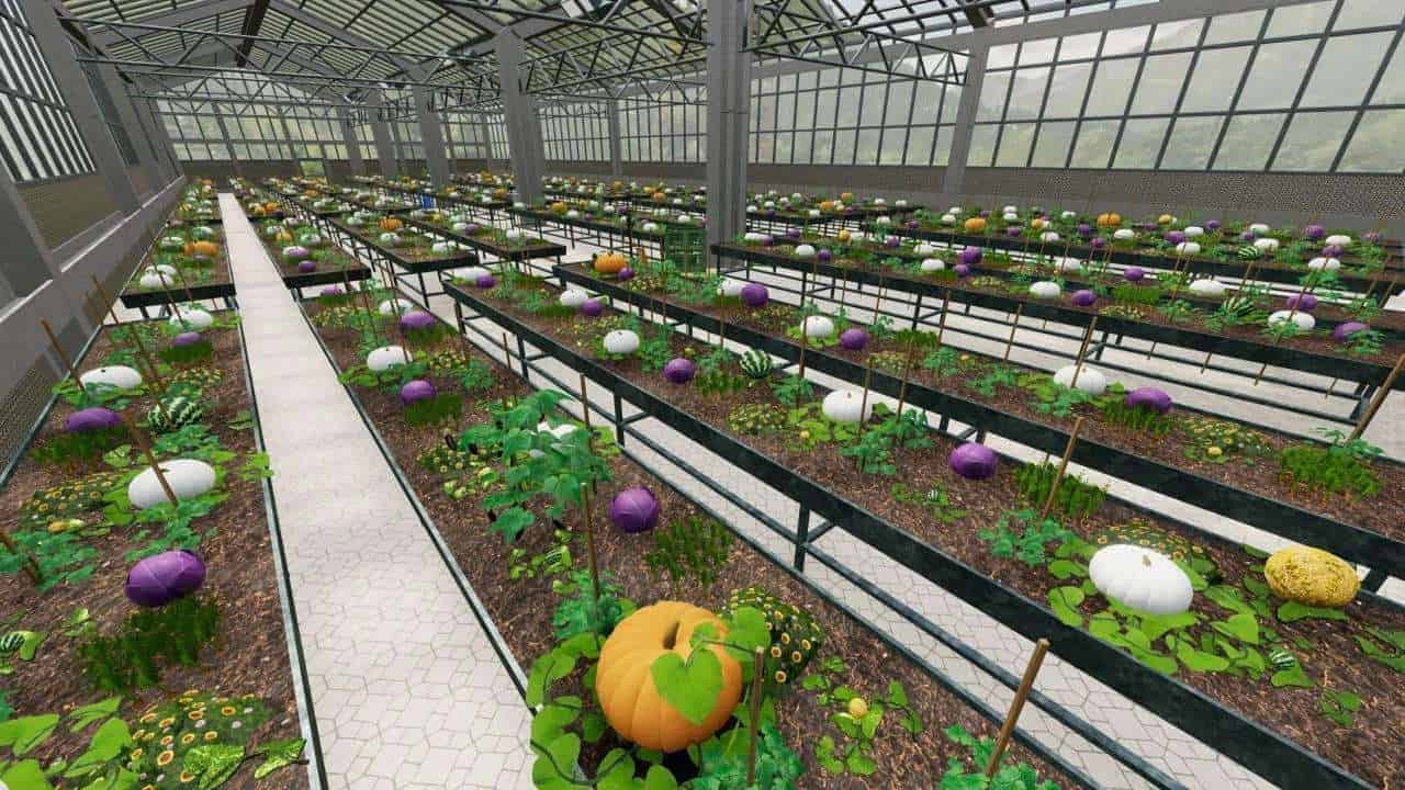 This is realistic version of the greenhouse on industrial scale that now produce alongside the base-game lettuce, tomato and strawberry, new crops as: melon, watermelon, cabbage, red cabbage, flowers, pumpkin, cucumber, onion, cauliflower, potato, cotton, soybean, sugarbeet, bean, pea, mushroom, eggplant, hops chili and bell pepper. I even added tree saplings (spruce only spawns, don’t know how to change)