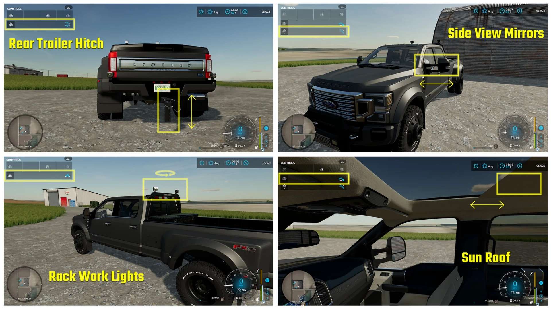 I purchased the models for the body and chassis, Body & interior were modeled by the Squire Team. Chassis is a hybrid of purchased models and parts I built myself, I modeled the accessories (flatbed, hitches, racks, boxes) with blender 2.8 & 2.9. The sounds are from Roro Customs F450 King Ranch for FS19.
