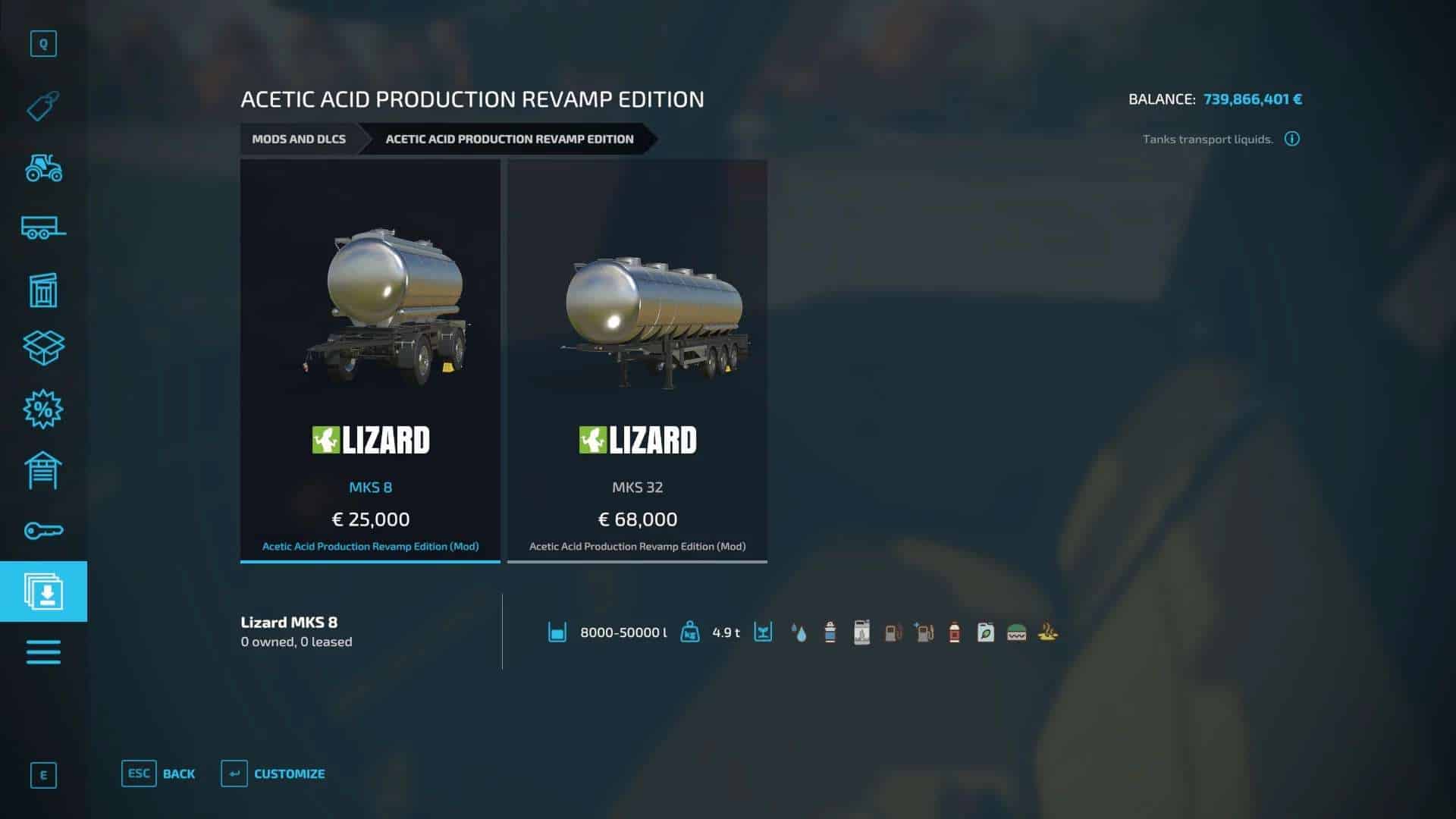 The mod includes acetic acid production, silo for compost, silo for acetic acid, one trailer and one semi-trailer for all liquids. With the acetic acid production can be produced from silage – acetic acid, as a by-product is compost. Compost and acetic acid can be sold either directly at the storage silo or at the wholesale and further processed in still appearing productions. Revamp 1.2.0.0 or newer is required to use this mod and to enjoy the advantages of the revamp script, e.g. the respective fill levels can be read directly from digital displays. The mod info panel can be changed or hidden at the corners of the panel. Acetic acid production: Price: 65000 $ Capacity: – Silage: 1000000 l – Compost: 1000000 l – Acetic acid: 100000 l Compost silo: Price: 10000 $ Capacity: 10000000 l Acetic acid silo: Price: 10000 $ Capacity: 10000000 l Mks8: Price: 25000 $ – 40000 $ Capacity: 8000 l – 50000 l Mks32: Price: 68000 $ – 118000 $ Capacity: 32000 l – 150000 l