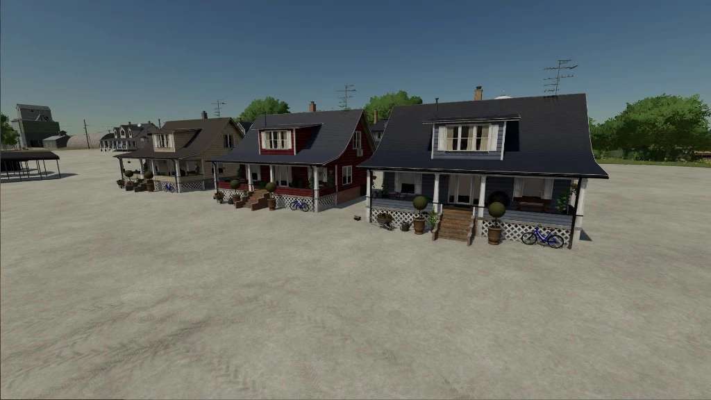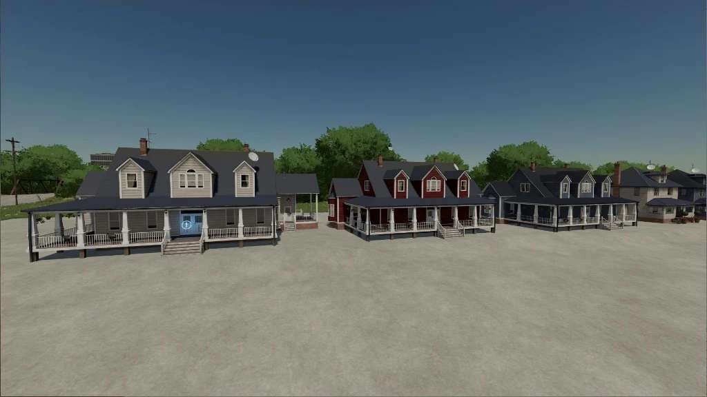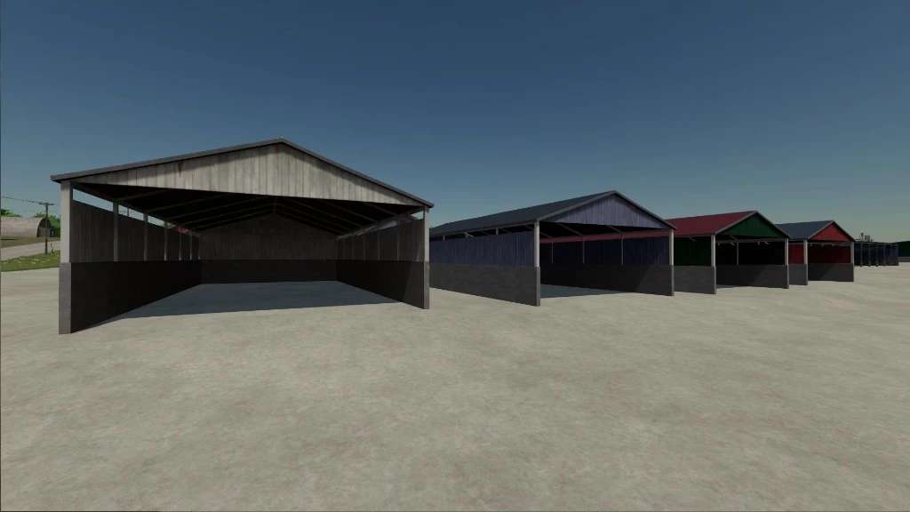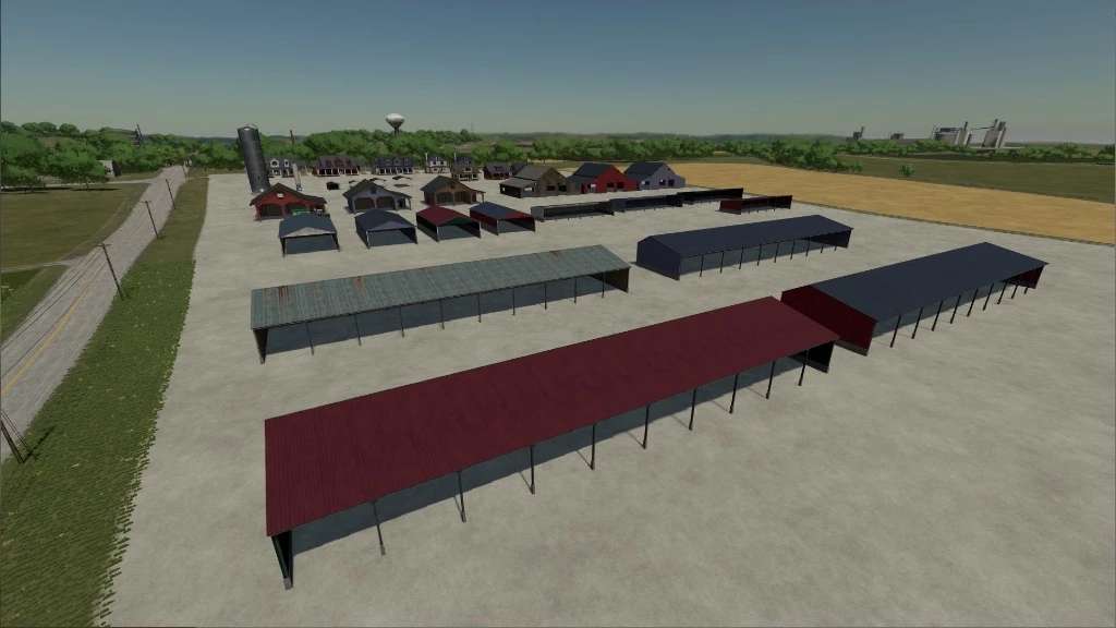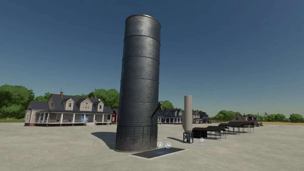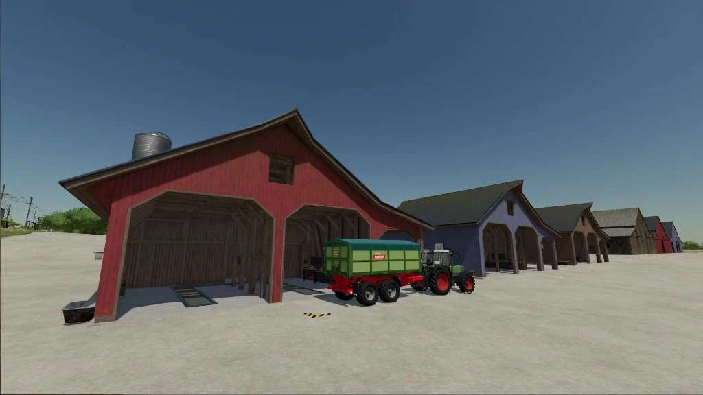 Farm buildings pack with buildings of Elmcreek. Contains 3 farm houses in different colors, one multi fruit silo, a buying silo, a workshop garage, multiple sheds and decorative houses. The multi fruit silo has a capacity of 5,000,000 liters.