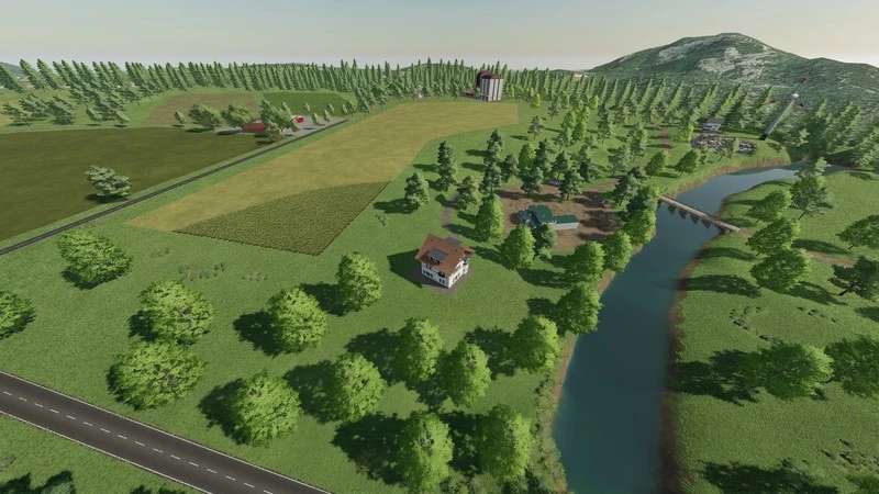 This is a fictional map. There are medium-large fields. A large forest area for forestry work.