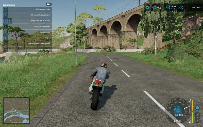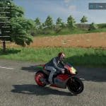 Animation of dashboard lighting, digital rev counter, rev limiter display, digital speed display, fuel gauge, time display (ingame time), gear shift display, temperature display, all indicator lights come on when the engine is started, steering movement, driver’s head movement when accelerating and stopping, tilting to the side of the motorcycle in curves, the driver’s gaze remains horizontal, bumps in the road simulated,