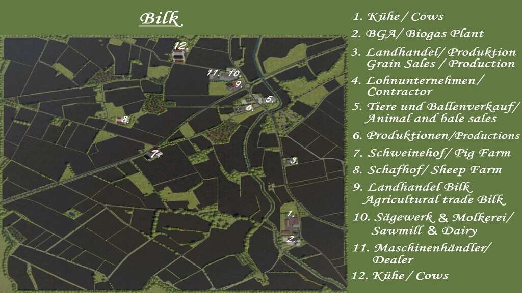 This map is a faithful replica of the original landscape of Bilk. It is a fairly flat area consisting of many small fields and meadows. However, larger machines are also used here.