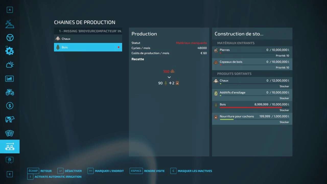 It produces: wood that will be compacted, and it is up to you to send it to another factory to make boards and produce pig food thanks to the acorn tends that the stones will be crushed and kneaded to make hot and cold wood. Silage additive.