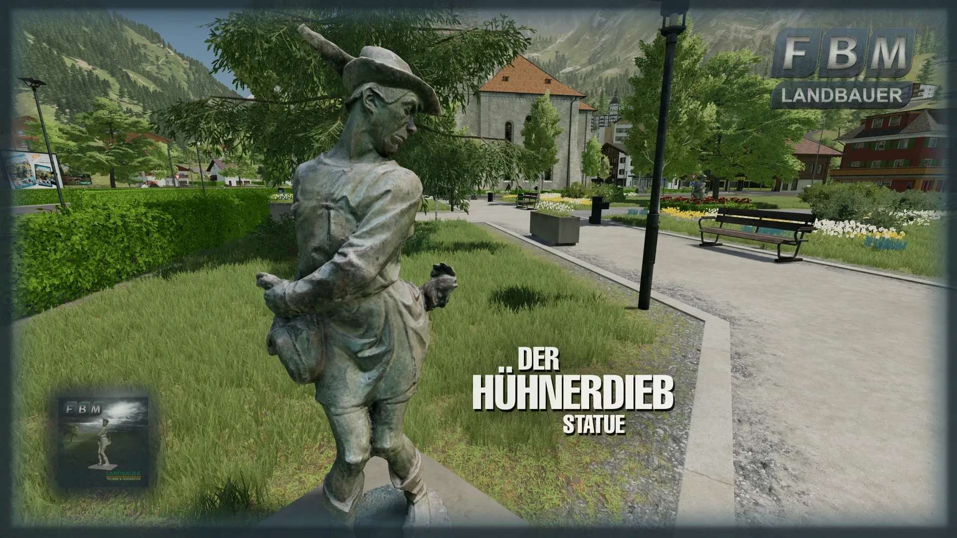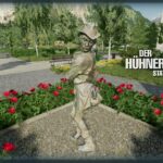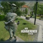 The chicken thief, on a round plinth stands the clothed figure of a man who is just putting a chicken in his left shoulder bag, while a rooster is already caught in the right one. The position of the limbs is angled several times, the upper body is turned, together with the figure looking downwards and the hat feather pointing upwards, the result is a depiction of a moving situation. The lively story seems to stop for a moment.