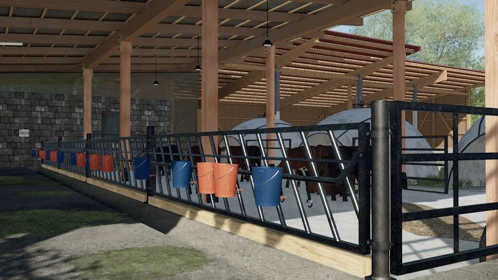 A calf barn with group igloos, generous straw area, and animated milk buckets. ($ 40,000)