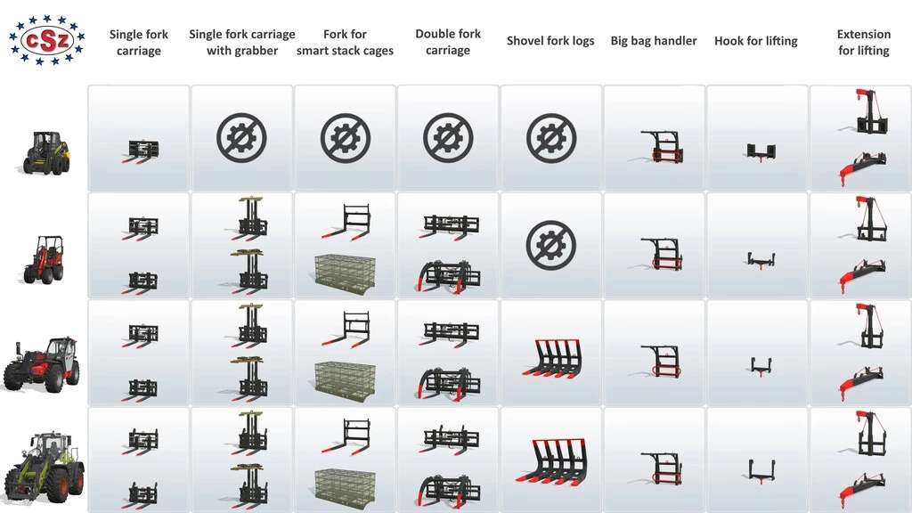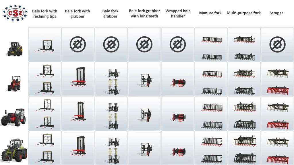 CSZ Pack contains equipment for tractors, front loaders, skid steers, telehandlers and wheel loaders for Farming Simulator 22.