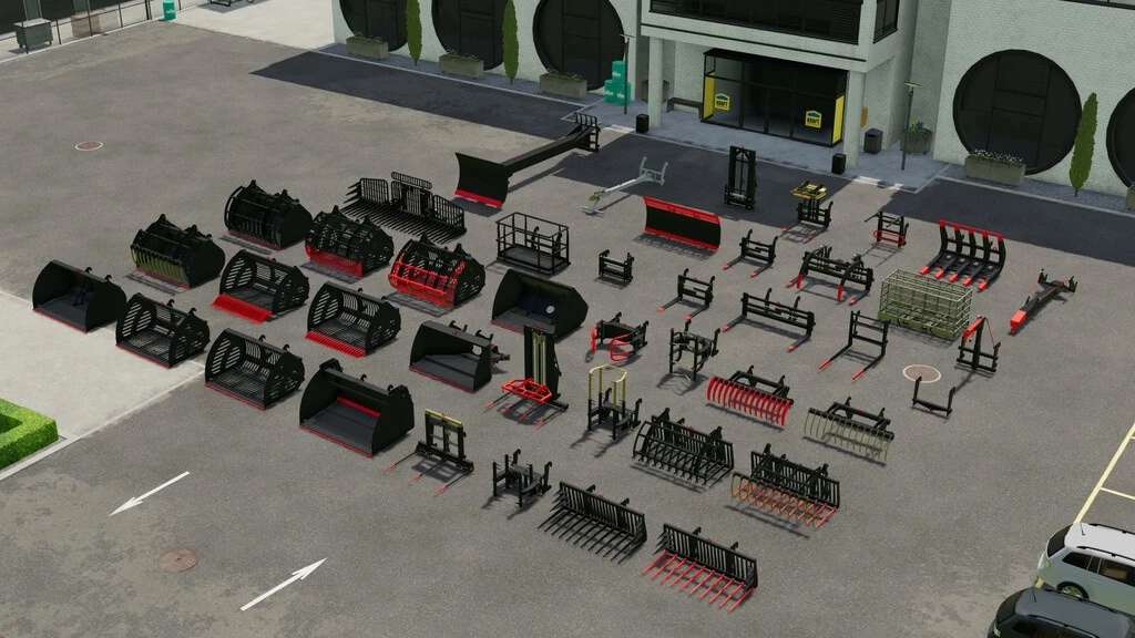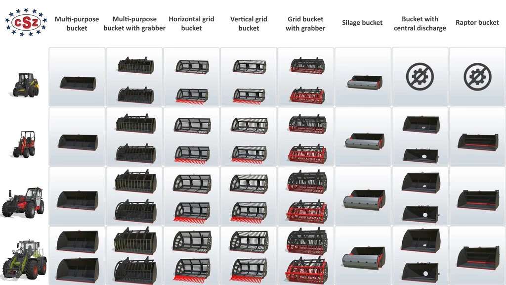 The pack contains the following equipment: silage bucket, potato and beet bucket, regular bucket, bucket with grapple, raptor bucket, center discharge bucket, bale forks, manure forks, forks with grapple, large forks, forks for wrapped bales, forks for nibbling, big bag grapple, extension, cage, adapters, translator, additional lift, pallet forks, fork carriage for intelligent stacking cages, pallet forks with grapple, double forks for Pallet, Log Fork, Log Shovel, Hoist Hook, Hoist Arm, Hoist Extension, Scraper, Dozer Blade, Dozer Blade with Extension and Mixer.