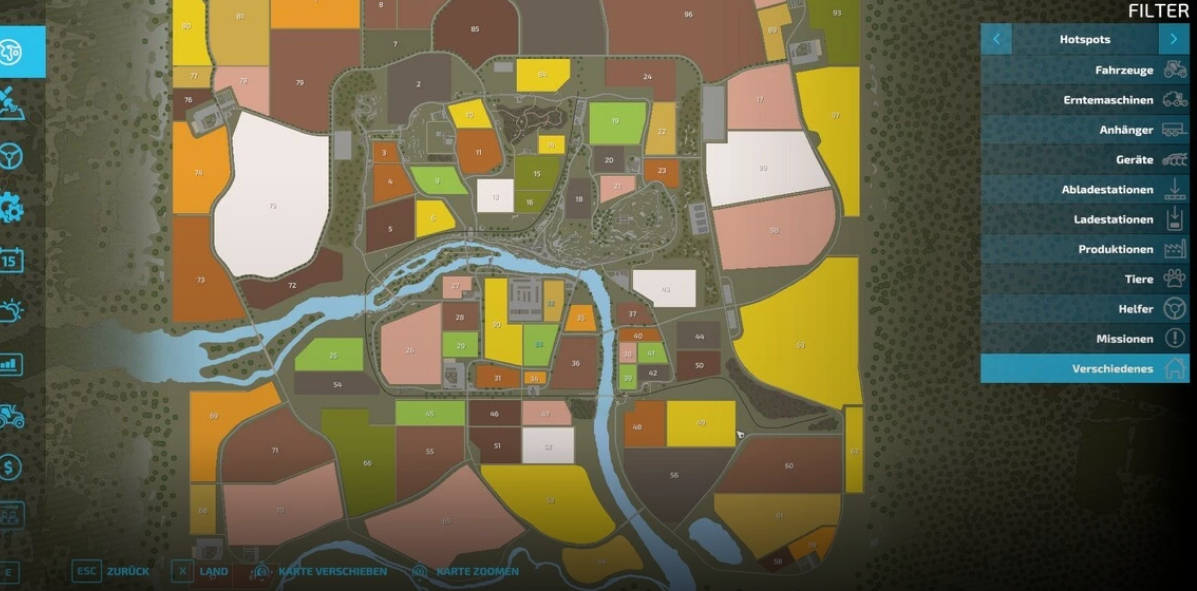 The map now has 99 fields (the largest has 50 ha), a Lohner main courtyard and 4 standard courtyards in the corners and also 4 BGA’s. There are also productions installed on the map that are visually larger on the one hand, but also have more bars (and cost). There is a large cow and sheep pasture for those of you who enjoy raising cattle. The top left fields are for grapes and the top right for olives (but don’t have to). Since the card is still in beta status, my clear recommendation is not to build anything further on it, because productions are still being added and existing products are being expanded. I installed a 4x fermenter/grass dryer at the hardware store, so 4 different players or farms can buy and use them here. No products can be sold in the productions, there are corresponding triggers for this, most of which have already been visually identified. There should also be no orders where stuff has to be carted into productions.