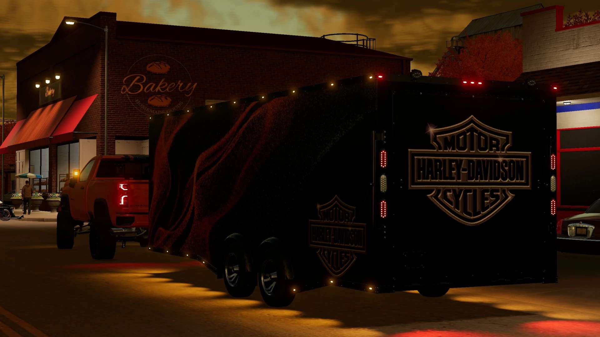 Here’s my enclosed car/bike trailer. It has 5 wheel options, worklight option, 3 light stages, also many skin and logo options. The body itself can be single or two tone paint scheme. Interior cabinets will change color with the main exterior color. It has a service trigger activated at the toolbox and the repair trigger is behind the tailgate (cones will appear). The side door and cabinets are interactive control, link below. If you have double letters showing for the service trigger such as MM . You need to delete the key 2 function in your controls. Enjoy!