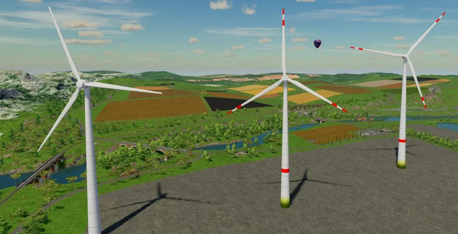 This mod consists of 9 wind turbines of the EP5 platform with different hub heights. The following are the features of the plants: