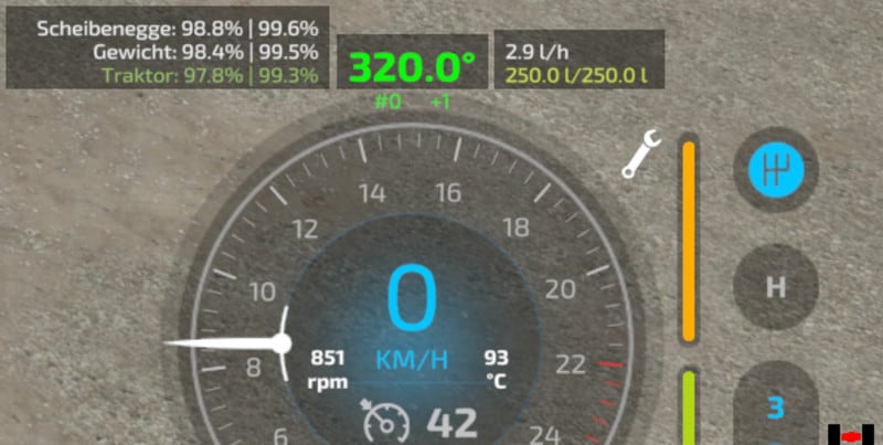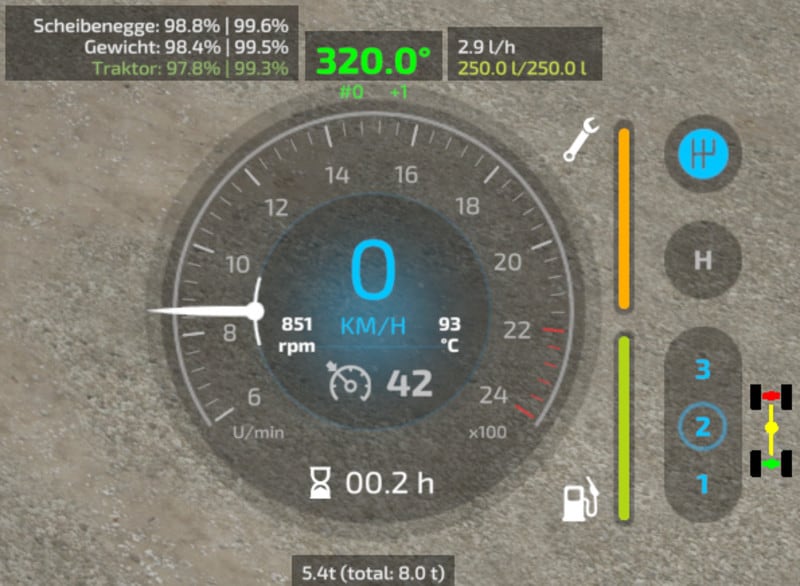 This mod adds a track assistant, differential locks, drive modes (all-wheel, RWD/FWD) and direct control of front/rear hydraulics and equipment to (motorized) vehicles. Additionally, the HUD gets a bit of an upgrade with a more detailed damage indicator, fuel tank level, fuel consumption, engine RPM and temperature, and weight/total weight.