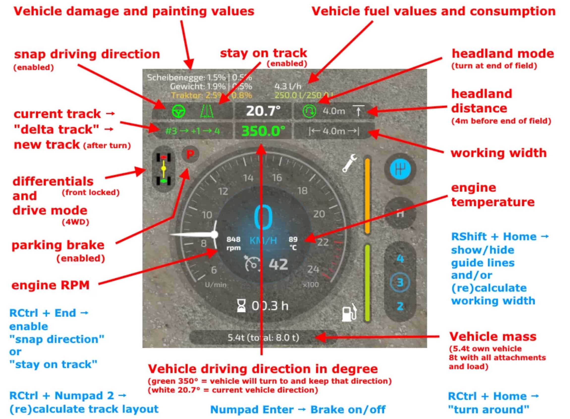 Track assistant, parking brake, differential locks, wheel drive modes and better hydraulics controls for your vehicle. Shows more vehicle details on HUD.