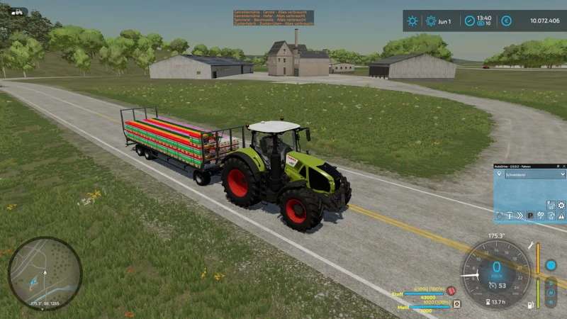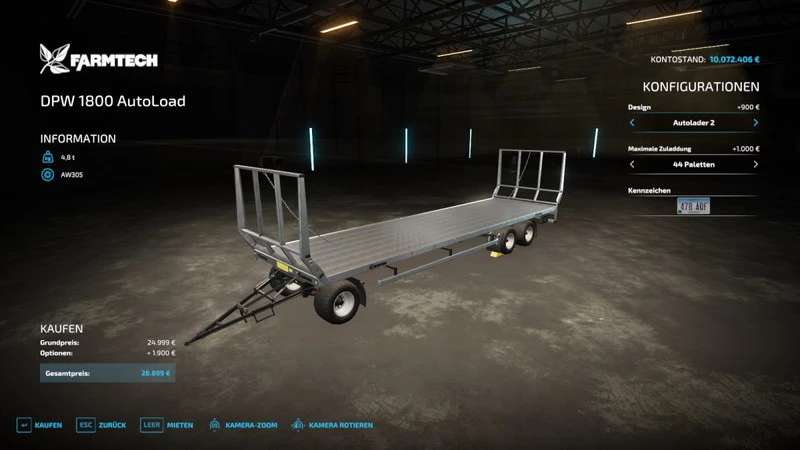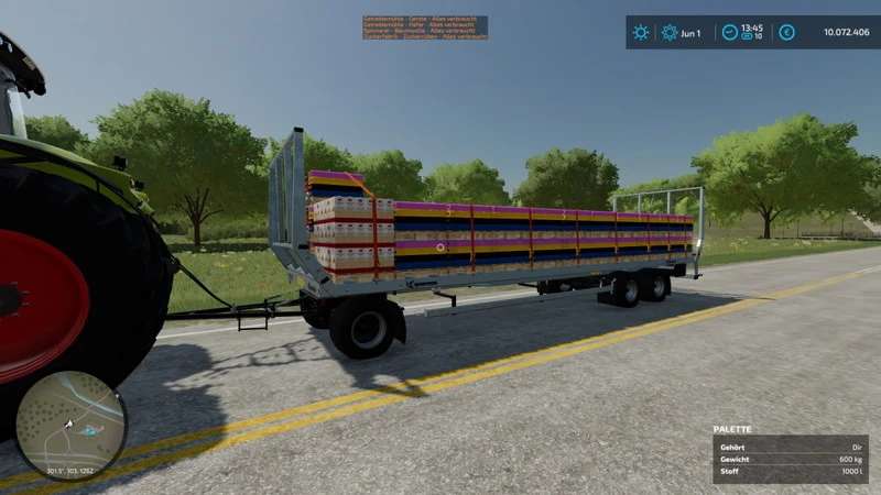 Euro pallets, liquid tanks, BigBag pallets, cotton round bales and oversized Euro pallets can be loaded by the pallet autoloader specialization.
