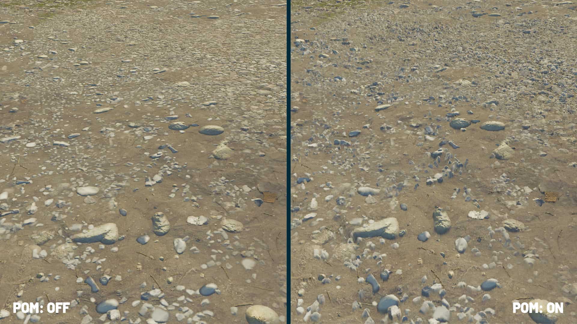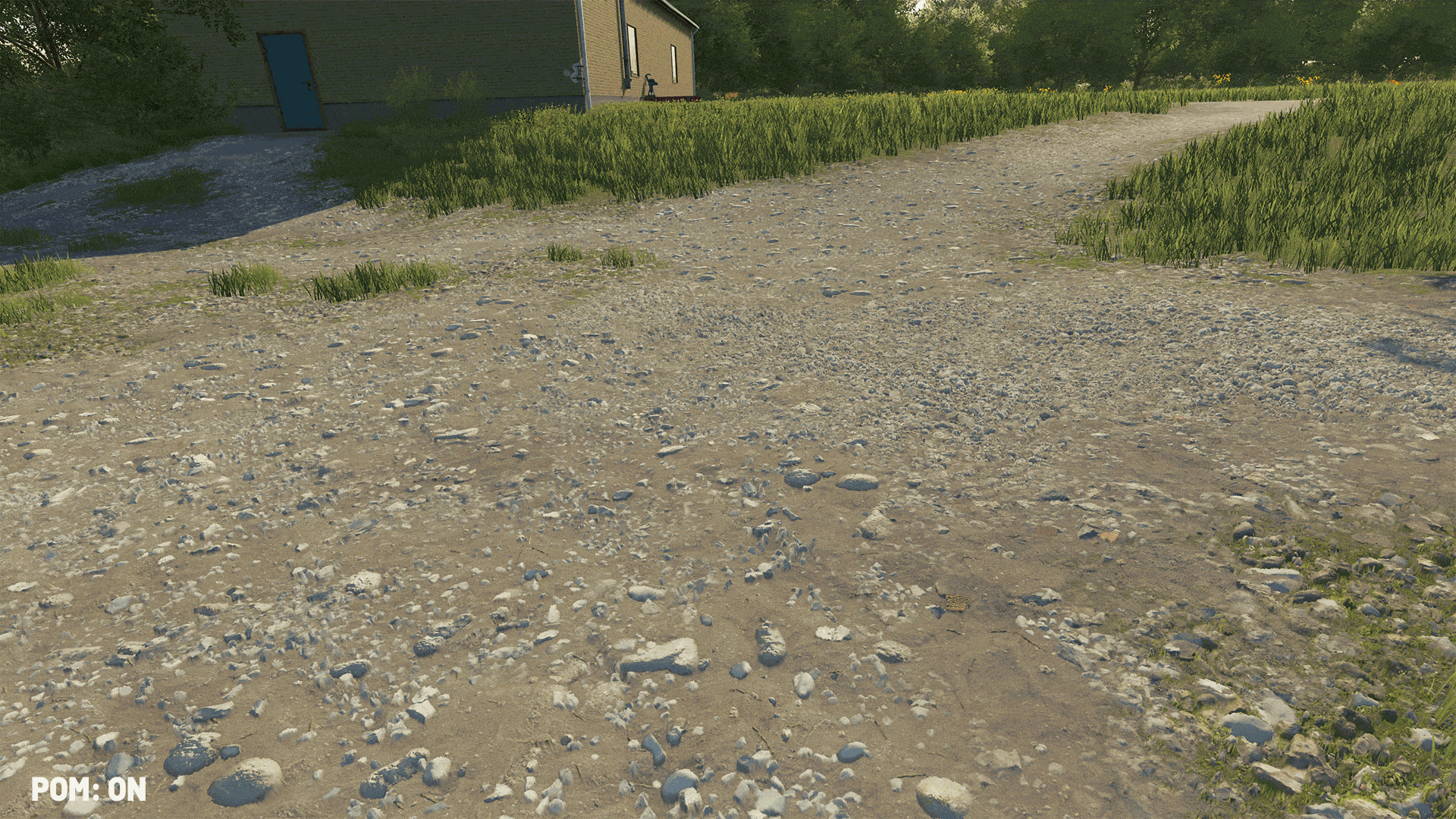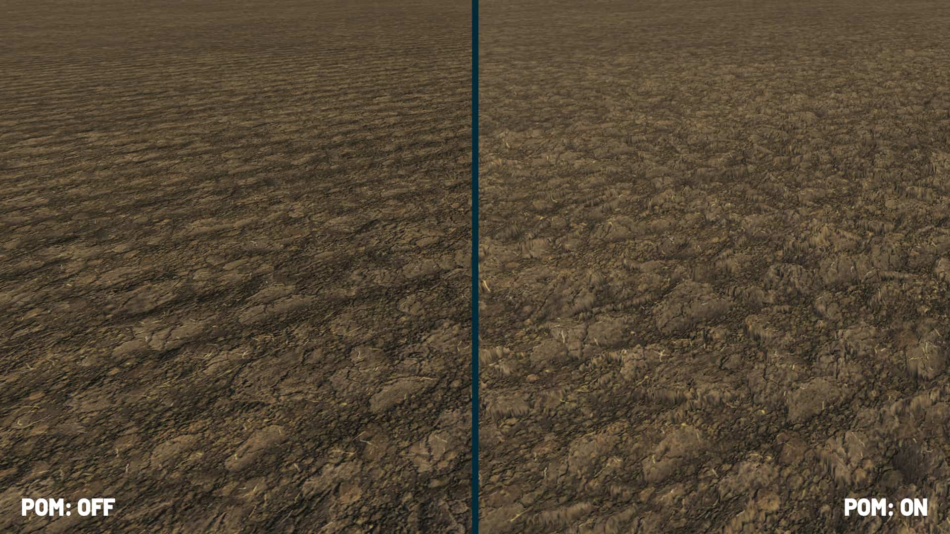 We’ll try to explain it as simple as possible: Parallax Occlusion Mapping is a technique that basically boosts the details of a textured surface to give it depth. Like the tire tracks on your field, trenching in the ground. They’re deeper now, and here’s why: