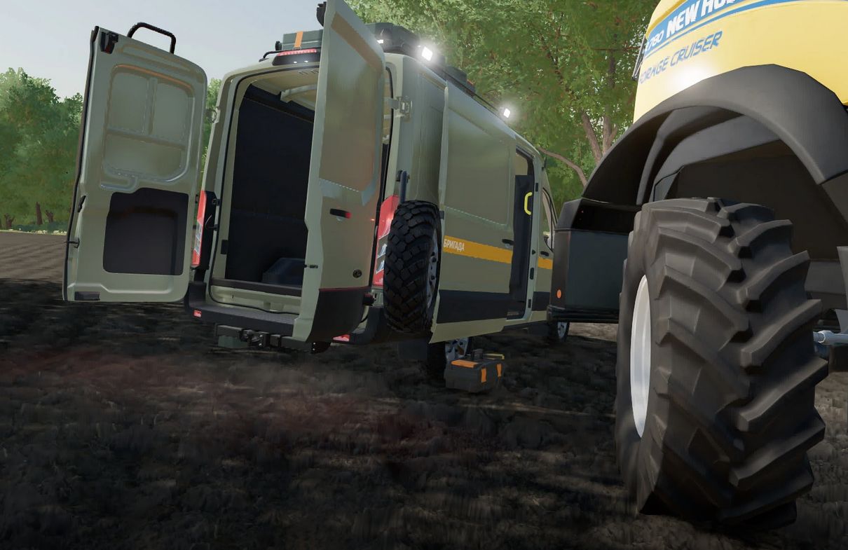 Changed and added engine sounds and more. Made classic animations of entry/exit and folding/unfolding with opening doors, remade and supplemented the lighting, remade the wheels and added an external tuning pack with off-road tires, a trunk, a trunk and chandeliers on the roof. In addition, added belts in the van and a spare wheel in two versions – normal (at the back under the frame) and off-road (on a remote folding bracket). Animated the cardan, added stylized paintwork on the sides, selectable configurations, changed the color palette. Corrected a few little things for the beauty and optimization of the model.