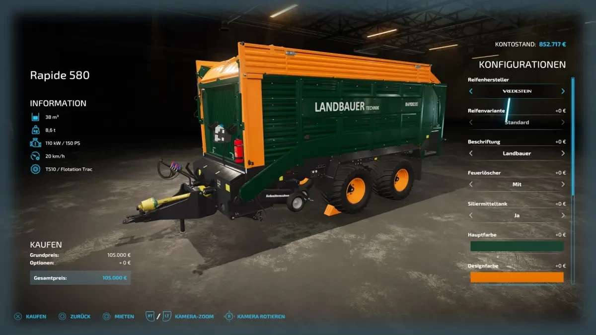 The Landbauer RAPIDE 580 is a conversion of the model from the manufacturer Schuitemaker. With its equipment and its 38,000 L capacity, the RAPIDE 580 is ideal for medium-sized farms. Visually, it has been adapted to the Landbauer Technik series and equipped with some additional small changes and improvements.