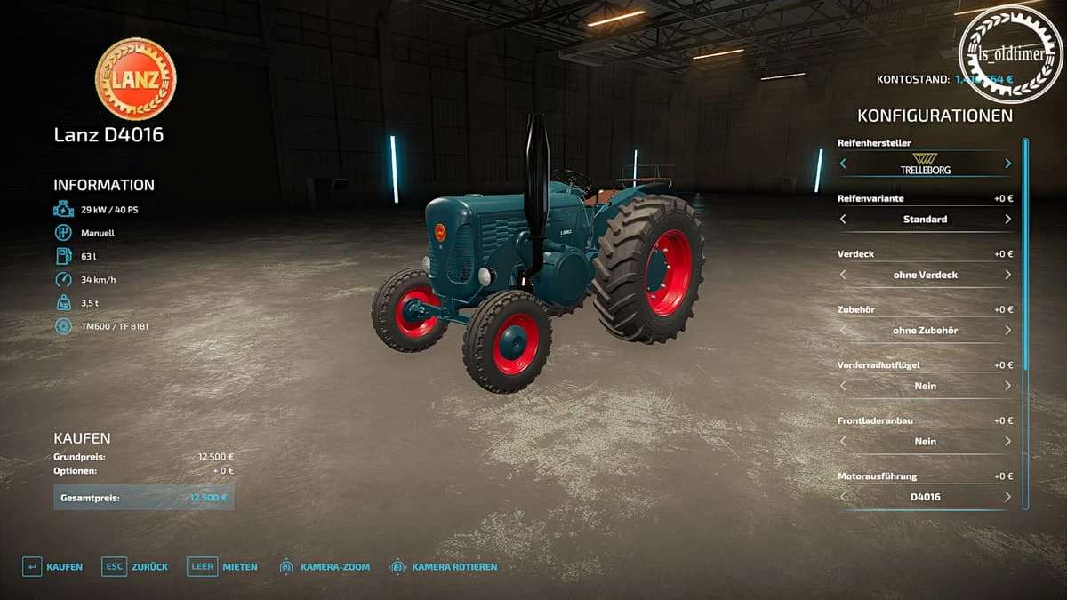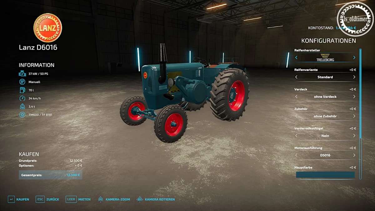 Front loader attachment with and without front protectionFront mudguardLanz Bulldog and John Deere Lanz engine variantsAttachments compressed air system, silencerColor choice of the rimsBody color choiceChoice of color for hood grilleChoice of color field clawLicense plate