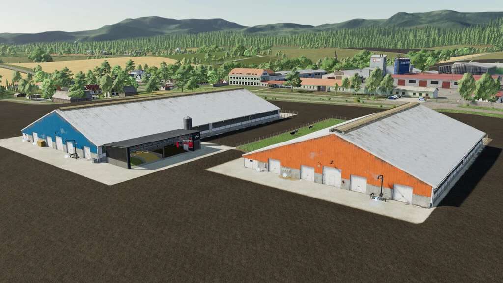 Cow barns with small outside pastures. 2 size variants and both has also variant with feeding robot, 4 placeables in this pack in total.