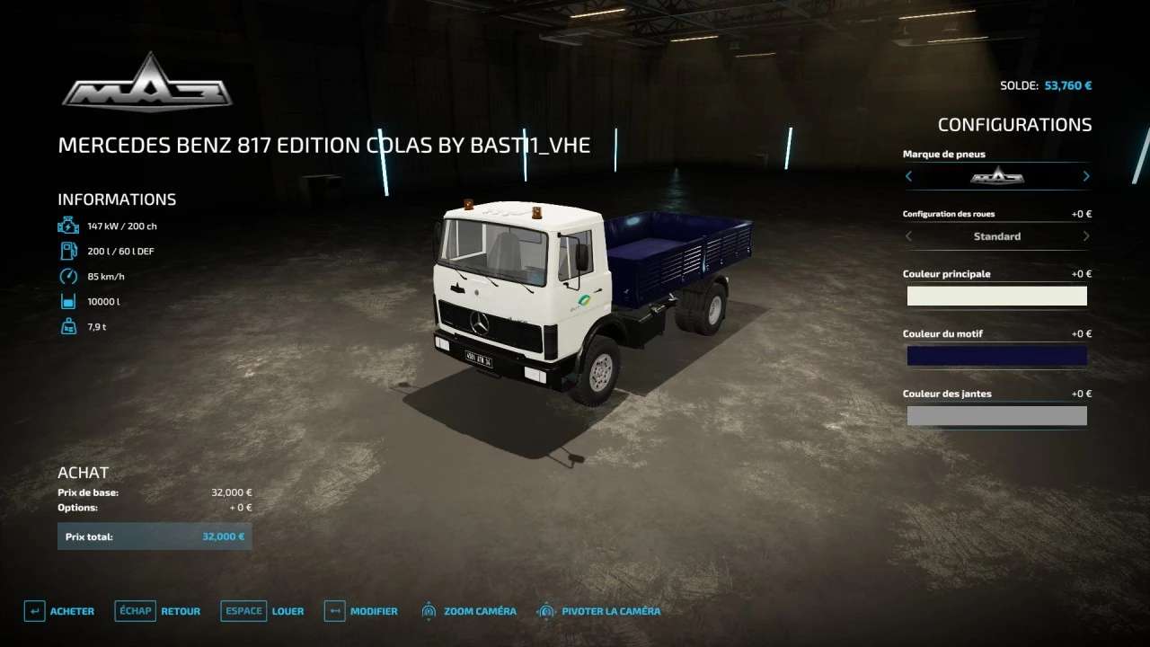For this eighth mod, I offer this Mercedes Benz 817 (mounted on an original MAZ chassis) for FS22: