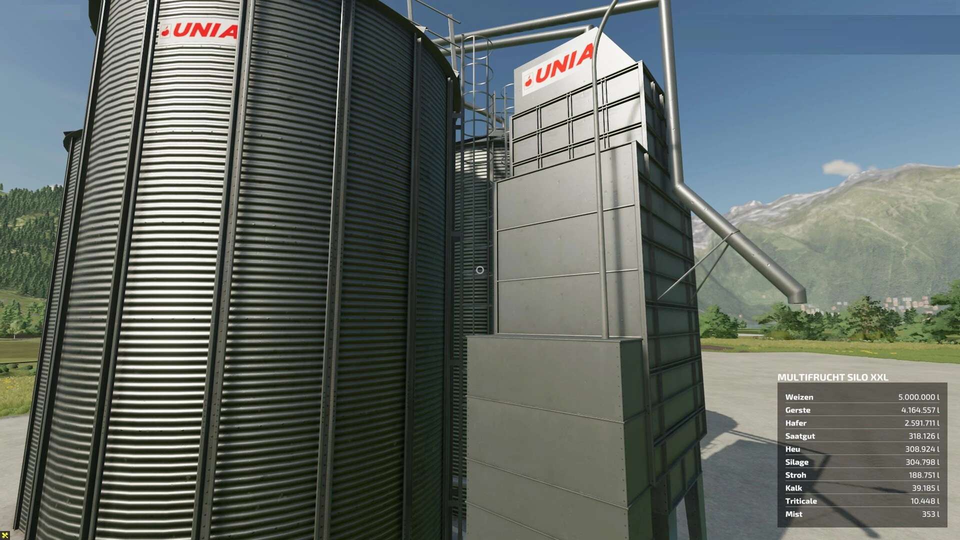 As in the LS19, this multi-fruit silo XXL can store 50 million liters in the silo and 25 million liters in the extension per fruit & fill type, which are entered in a map as the Bulk & Bales category. The silo also accepts bales, but they are stored as bulk goods.