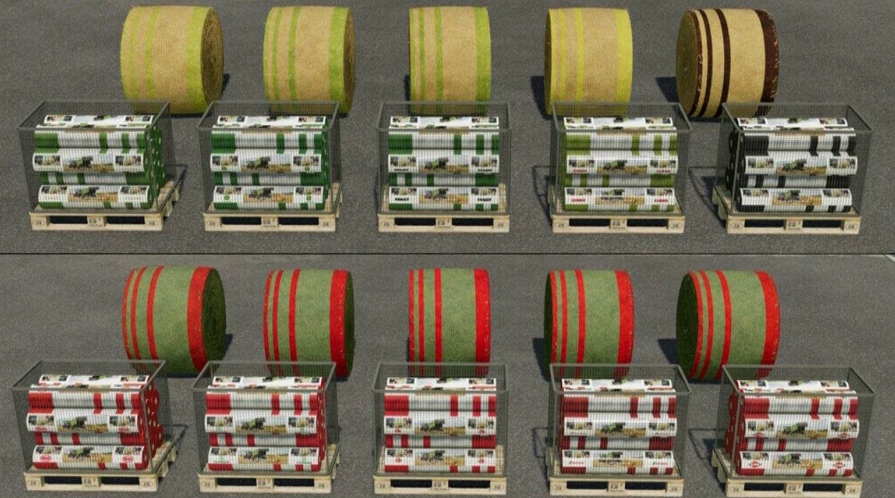 – Added pallets and bales with rolls of net wrap with different brands design
