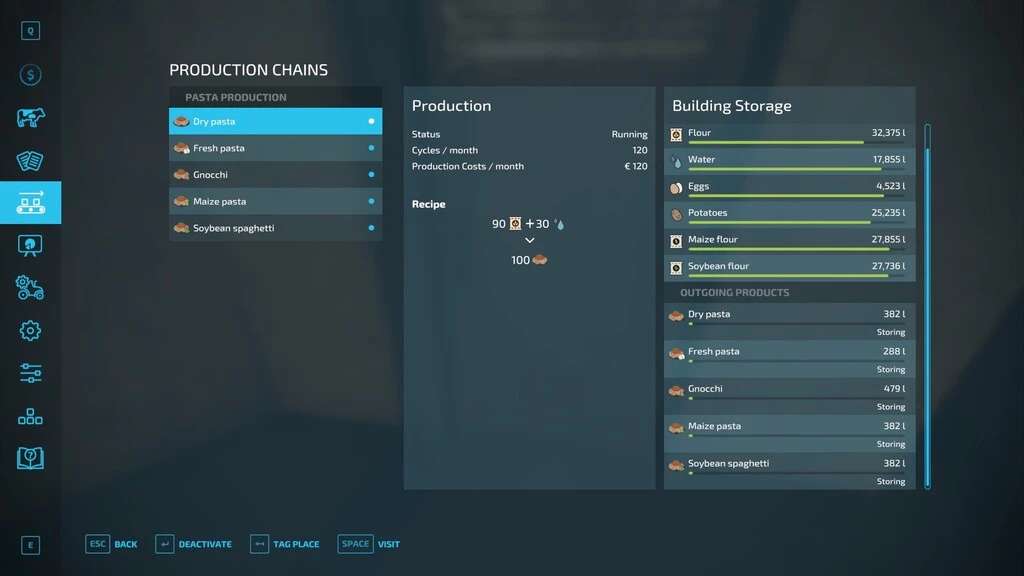 The mod also contains a placeable sales point (cost: $5.000) to sell pasta production products.
