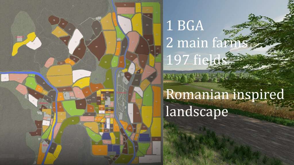 A romanian themed map build around some true terrain and fictional zones. Variety of field sizes, vineyards as most romanian lands have small size vineyards Livestock dealer BGA plenty of selling and production points 1 unexplored forest and 3 others ready to be cut down.