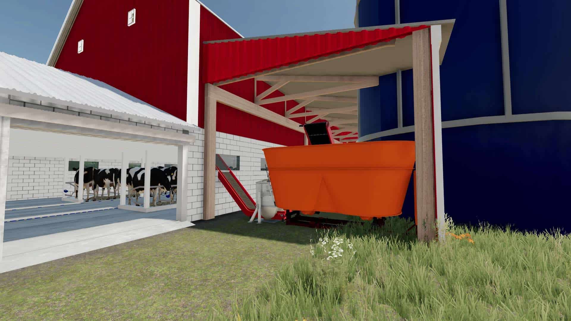 Meant for use with the JMF Dairy Barn, but useable however you choose. Many different options for rations. Load chaff and grass into the silos using the NH F62B Blower, with the option to load maize into the Harvestore, like high moisture corn. Can drop bales of hay into the mixer as well, or load chaff or grass into the mixer with a loader. Sorry, no option to load silage into the mixer (couldn’t figure out a way to make it flow well, could be a future update!)