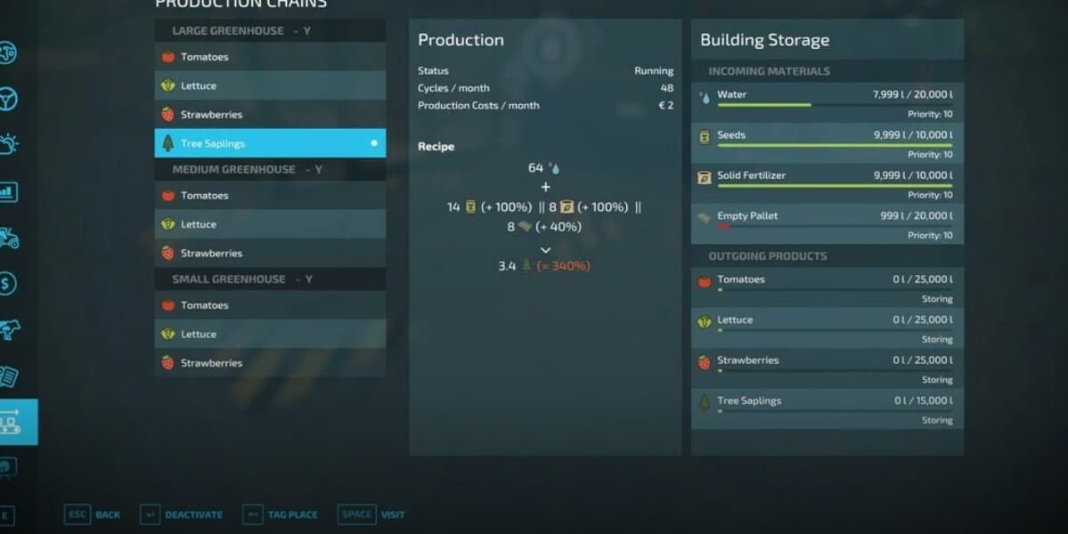 The greenhouses process water, seed, solid fertilizer and empty pallets as inputs. The boost factors are also used here. In standard operation, the greenhouses only need water to start production. Adding seeds increases production by 100%. Adding solid fertilizer increases production by 100%, adding empty pallets increases production by another 40%. This means you can increase production by a maximum of 240%. The large Greenhouse can also produce tree saplings. I had to make the Empty Pallet Production here as mandatory, otherwise you will get a warning when you don’t have one. It only needs to be installed, of course you can also use your own. The number of empty pallets in the internal storage are reflected as stacks beside the greenhouse.
