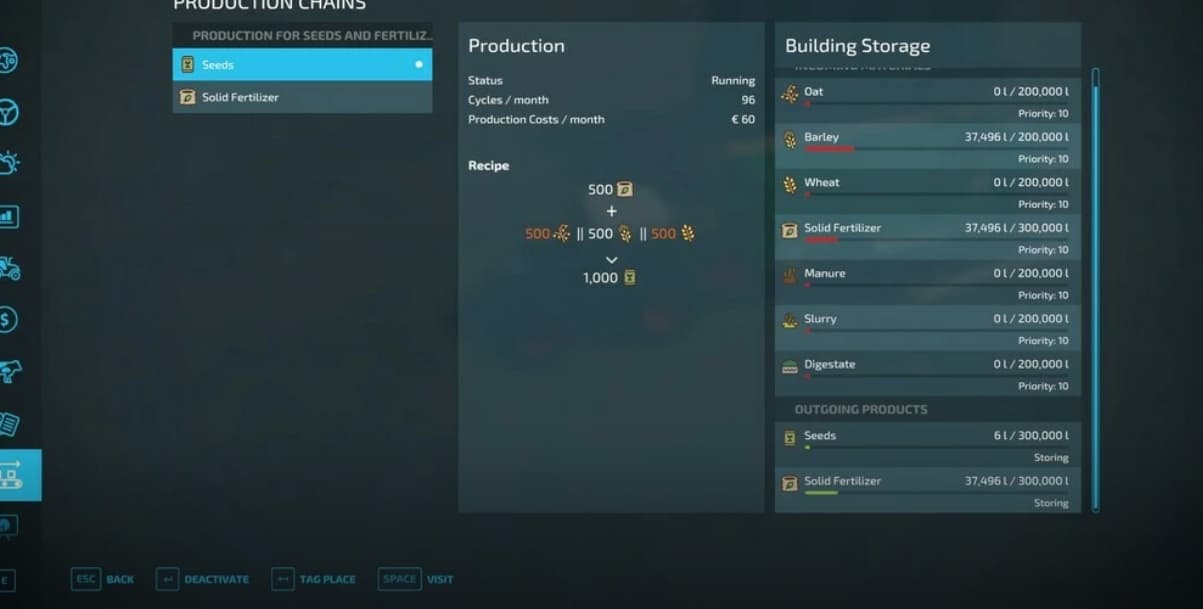 In this production you can produce solid fertilizer based on manure and either liquidmanure or digestate. For producing Seeds you need solid fertilizer and Grain. You can use wheat, barley or oat.