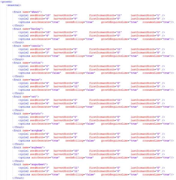 2. XML files. At this moment, the xml files are customized versions of fruitTypes.xml, fillTypes.xml, and sprayTypes.xml.