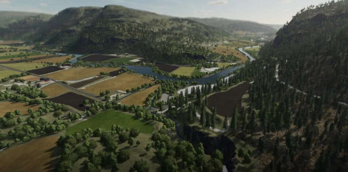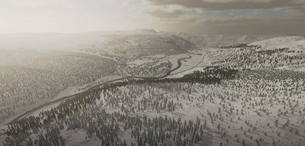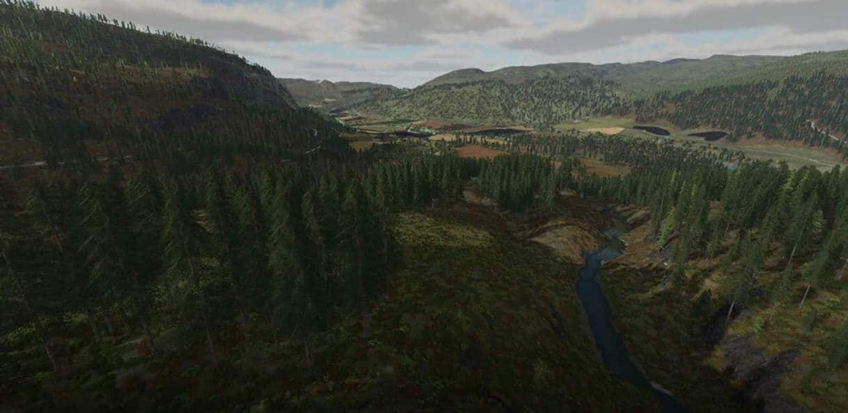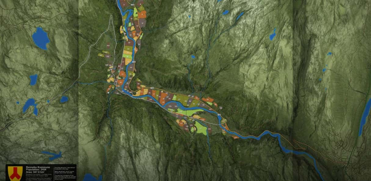 The map is based on a small part of the real world location Rennebu in Norway. The farms and farm buildings are real and placed at their real location.