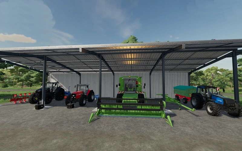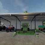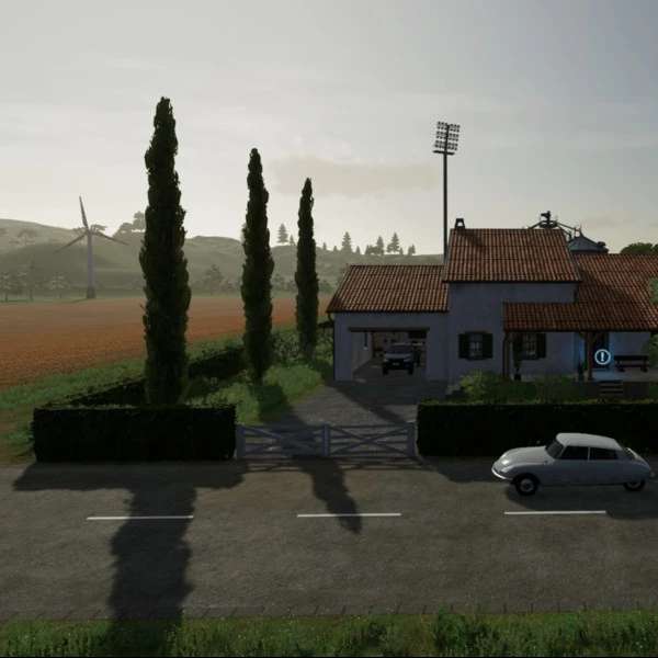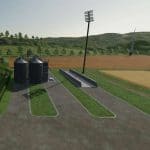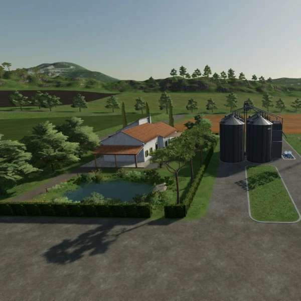 “Hay Barn” with 500,000 volume, “Solar Panel” income 14,400/month, Large “Windmill” income 67.680/month, Silo “Farma 800+OBI 1000” pre-filled with “Wheat” 12475 L, “Rape” with 9357 L, the “Hay Barn” and the “Solar Panel” can be purchased in the construction menu, as well as a larger “Chicken Barn” with 720 chickens capacity, 3 large “Floodlight Poles” for the yard, so that it is also bright there at night. All three fields are ready for harvest. With this equipment, even a beginner has no money problems.