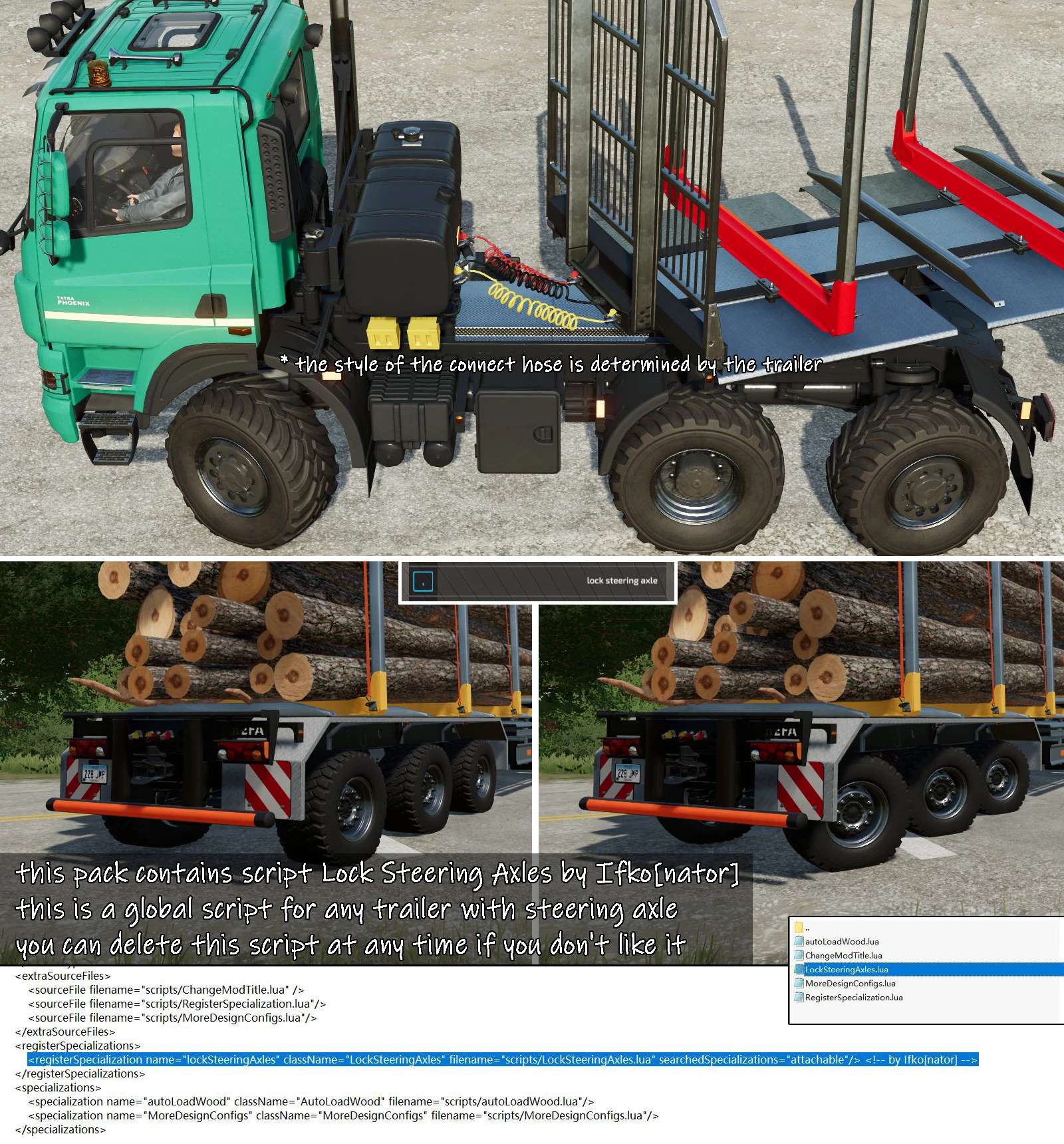 Notice: Several scripts are integrated in this file just for convenience. Including Auto Turn Off Turn Lights, Lock Steering Axles. If you don’t need them, you could delete the corresponding script files and the corresponding code in modDesc.xml at any time.