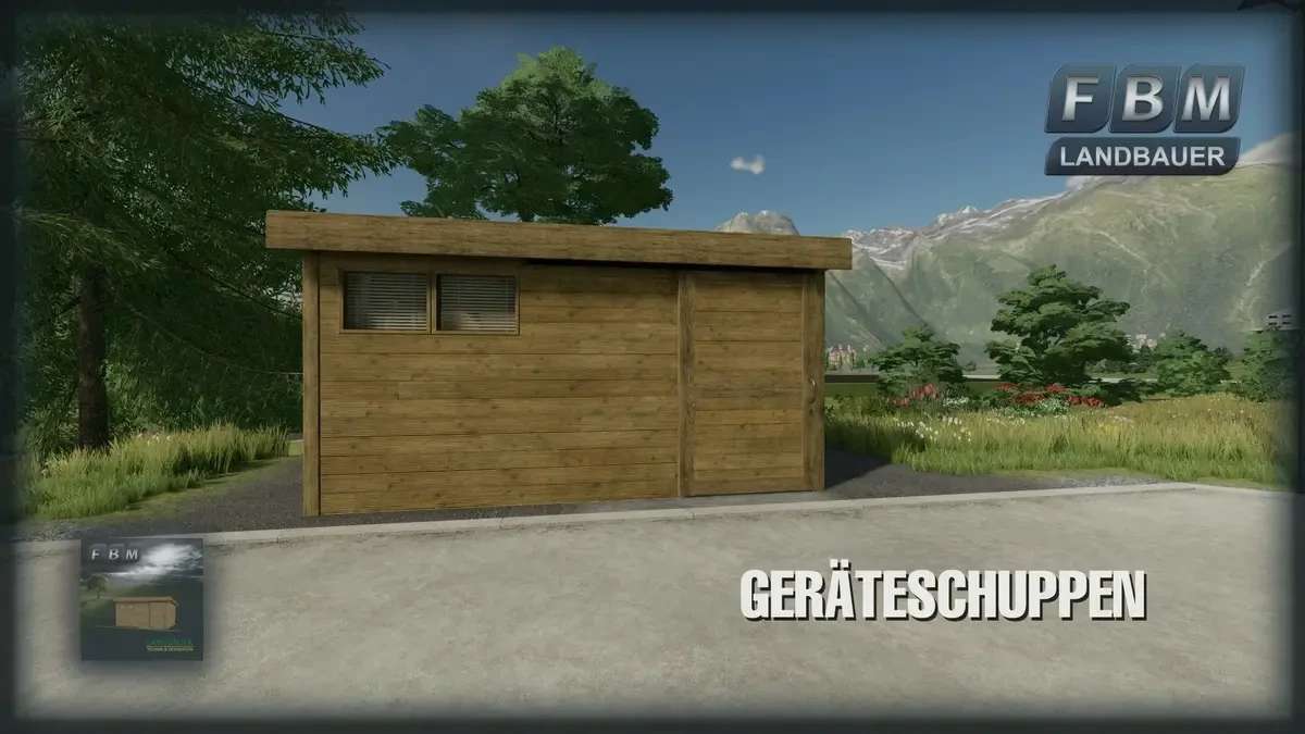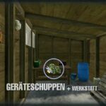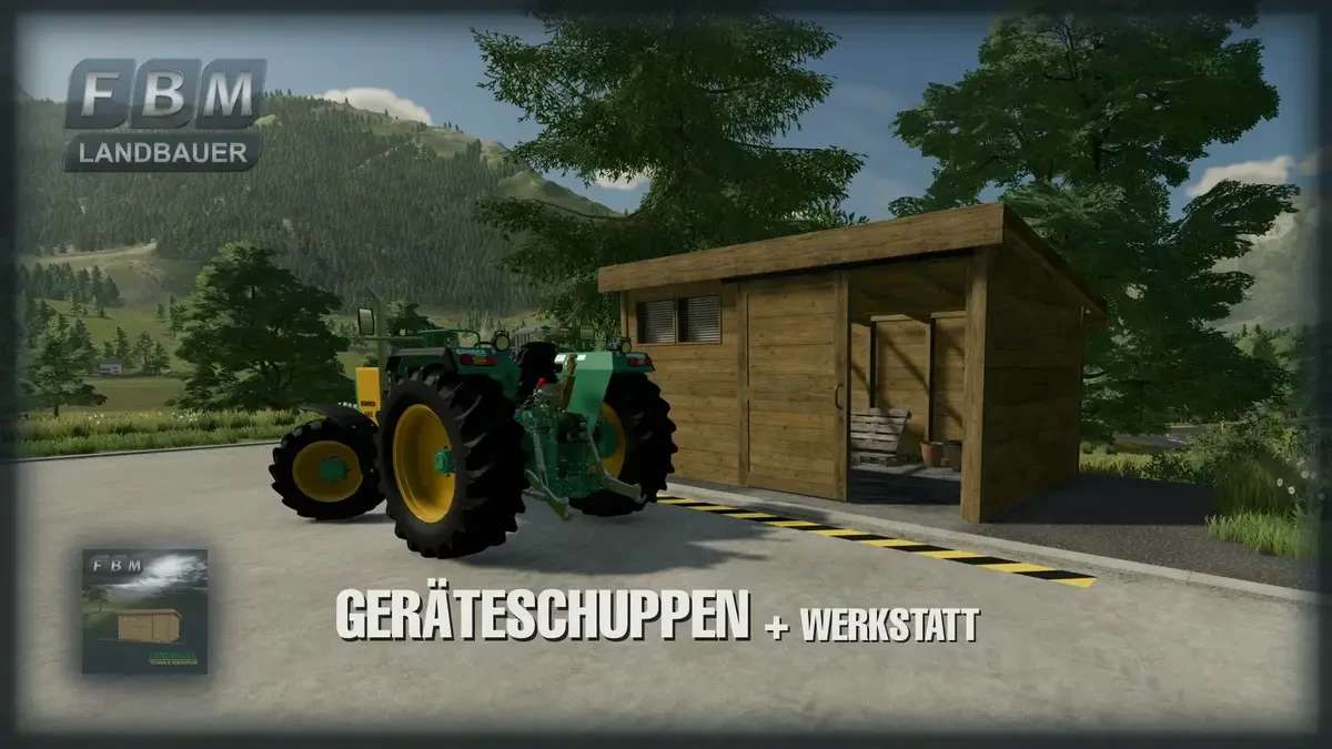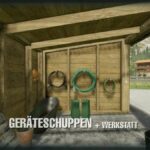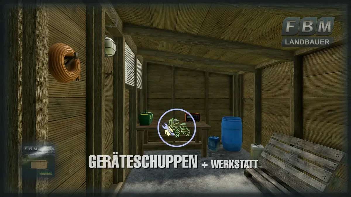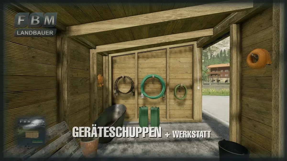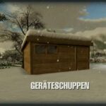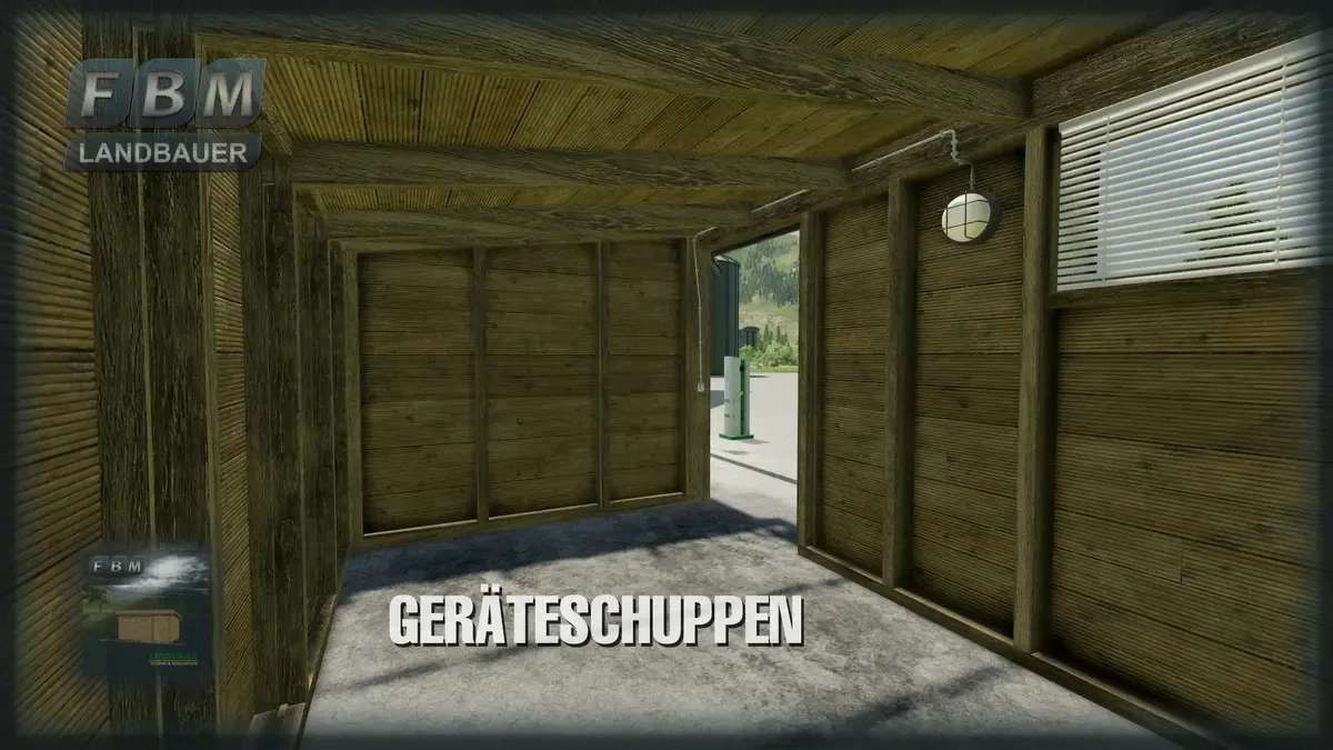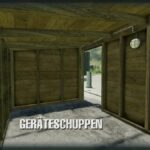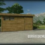 A simple wooden tool shed with a sliding door and interior lighting. Optionally empty, with some interior decoration and workshop function to repair or change vehicles and machines, etc.