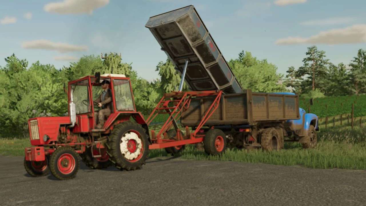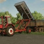 It is a springless trailer with a metal body, equipped with a hydraulic system. The base of the trolley is the vegetable universal platform POU-2.