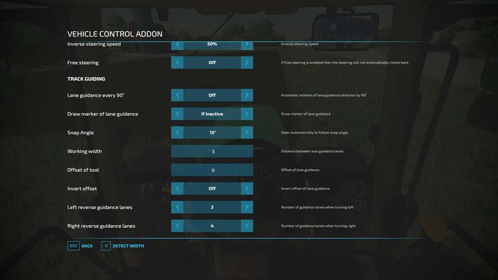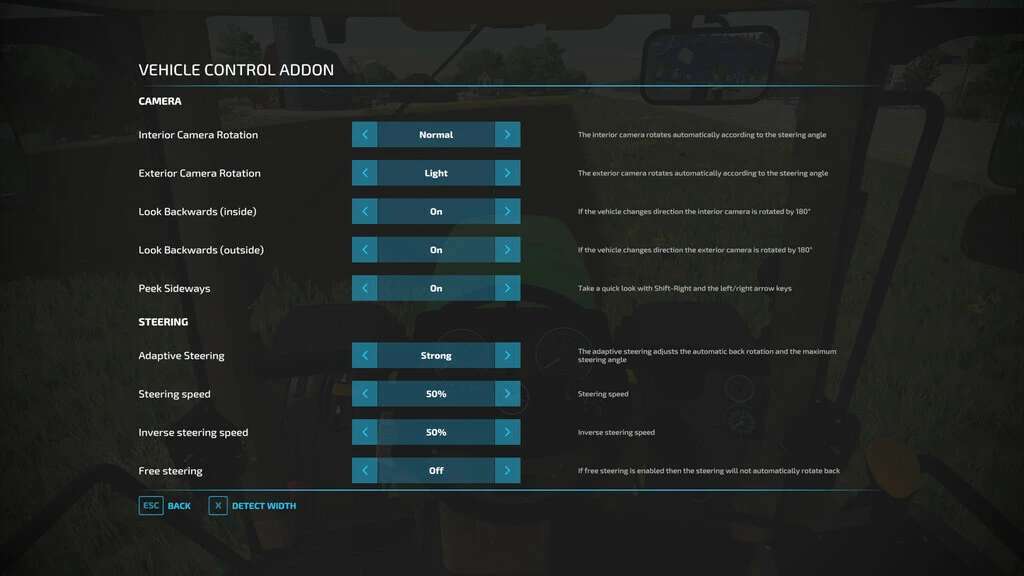 Most functions are turned off by default. VCA can rotate the camera to match the steering angle and direction. This way you always look into the direction you are driving to. With Shift-right and the cursor keys, you can peek in the corresponding direction. Shift-right limits throttle, cruise control, and maximum rounds per minute to 75%.