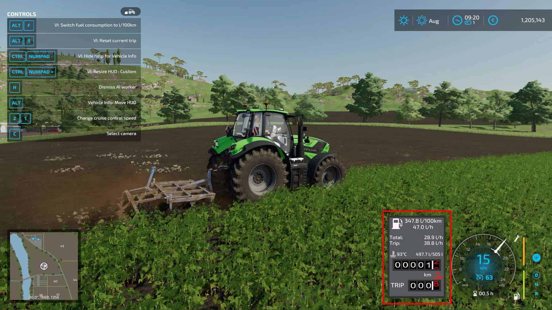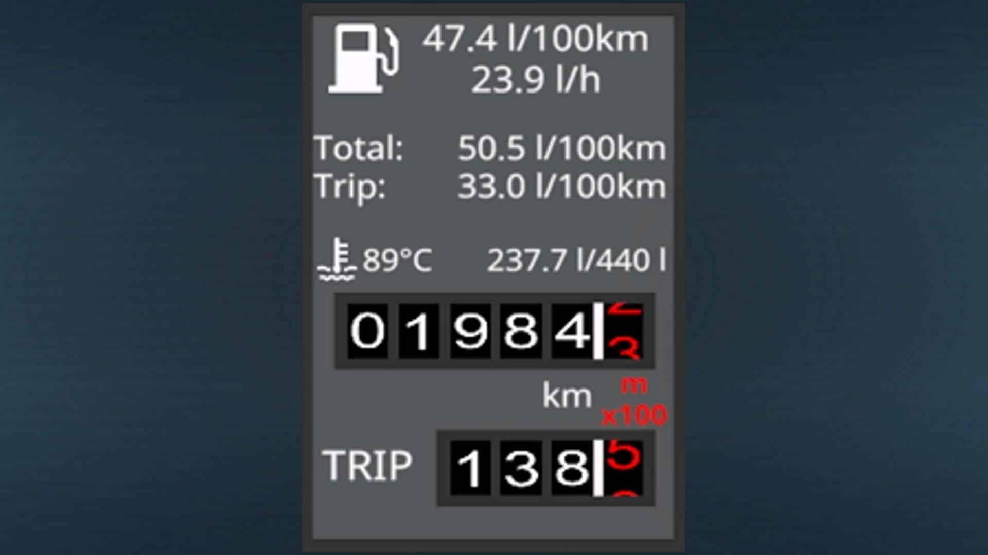 This mod shows you additional info about your vehicles like distance traveled in Km, fuel consumption or motor temperature.