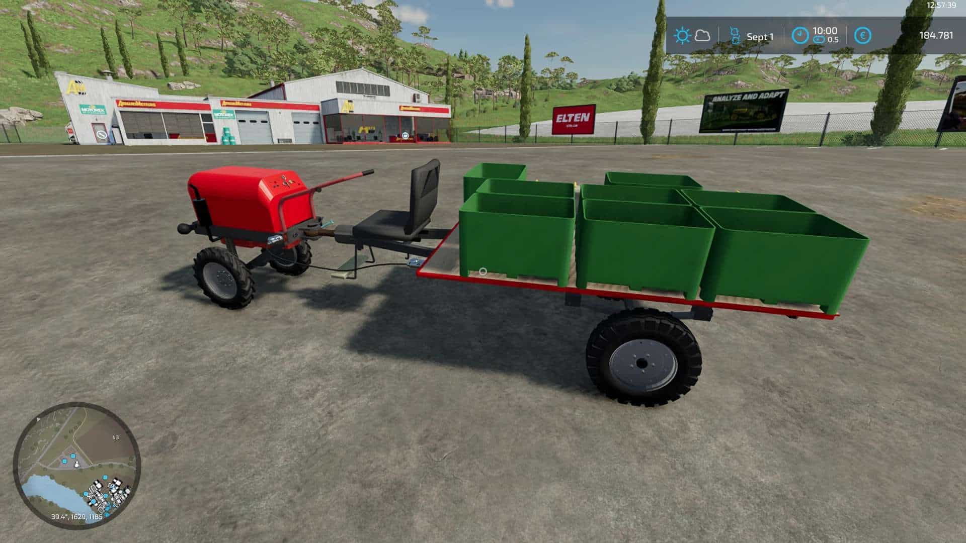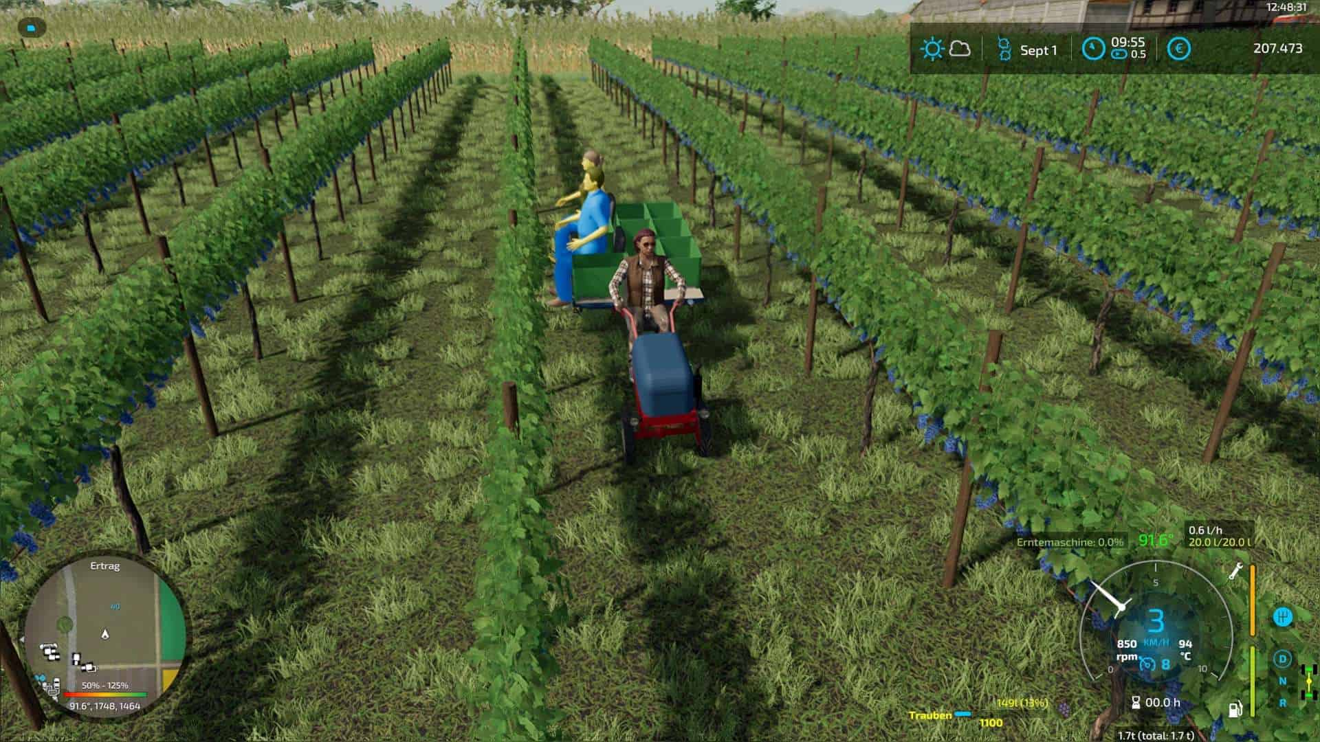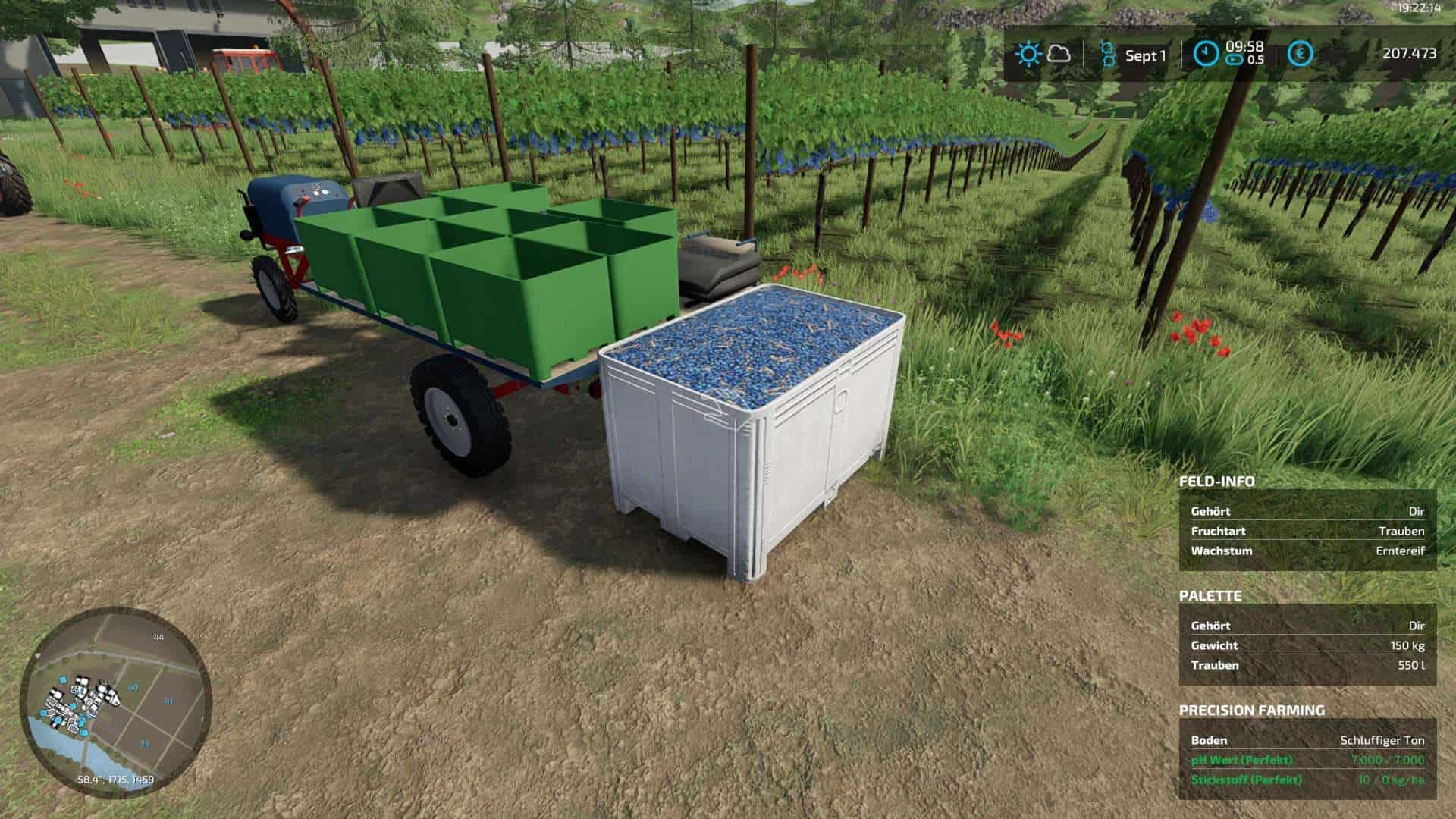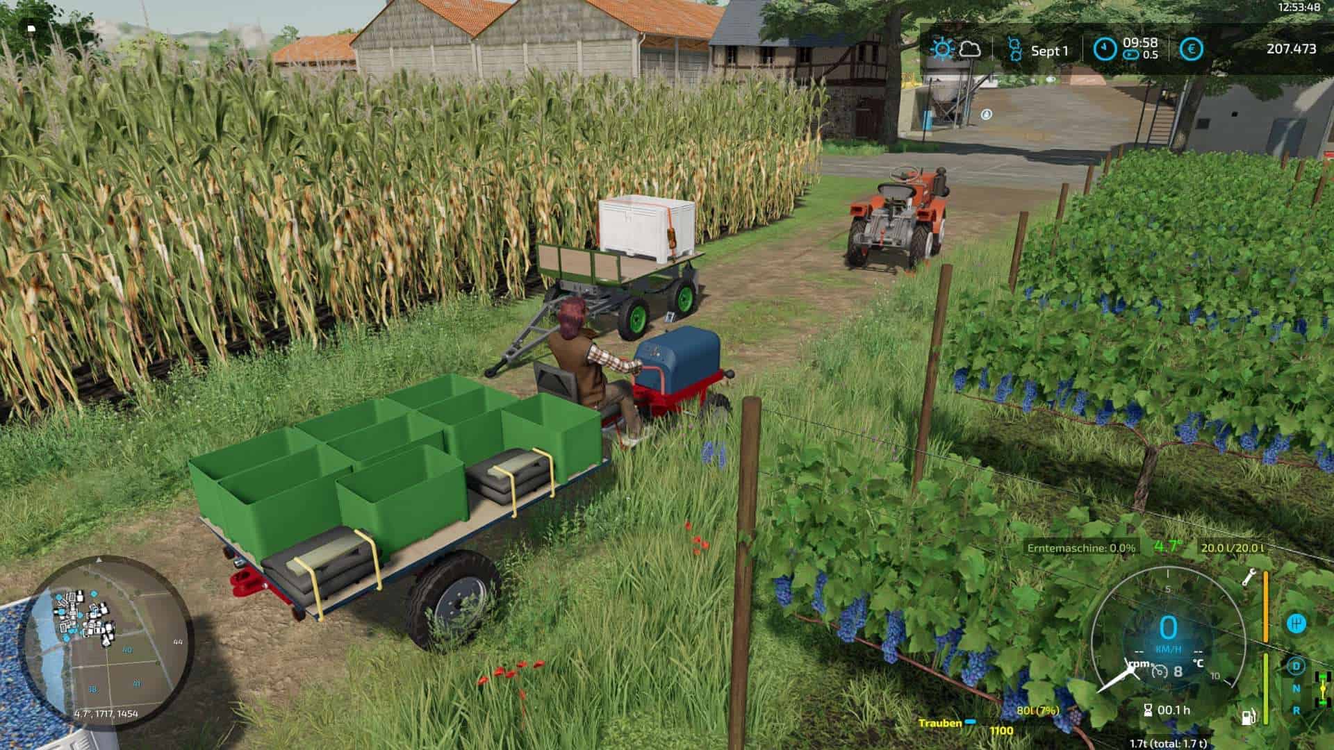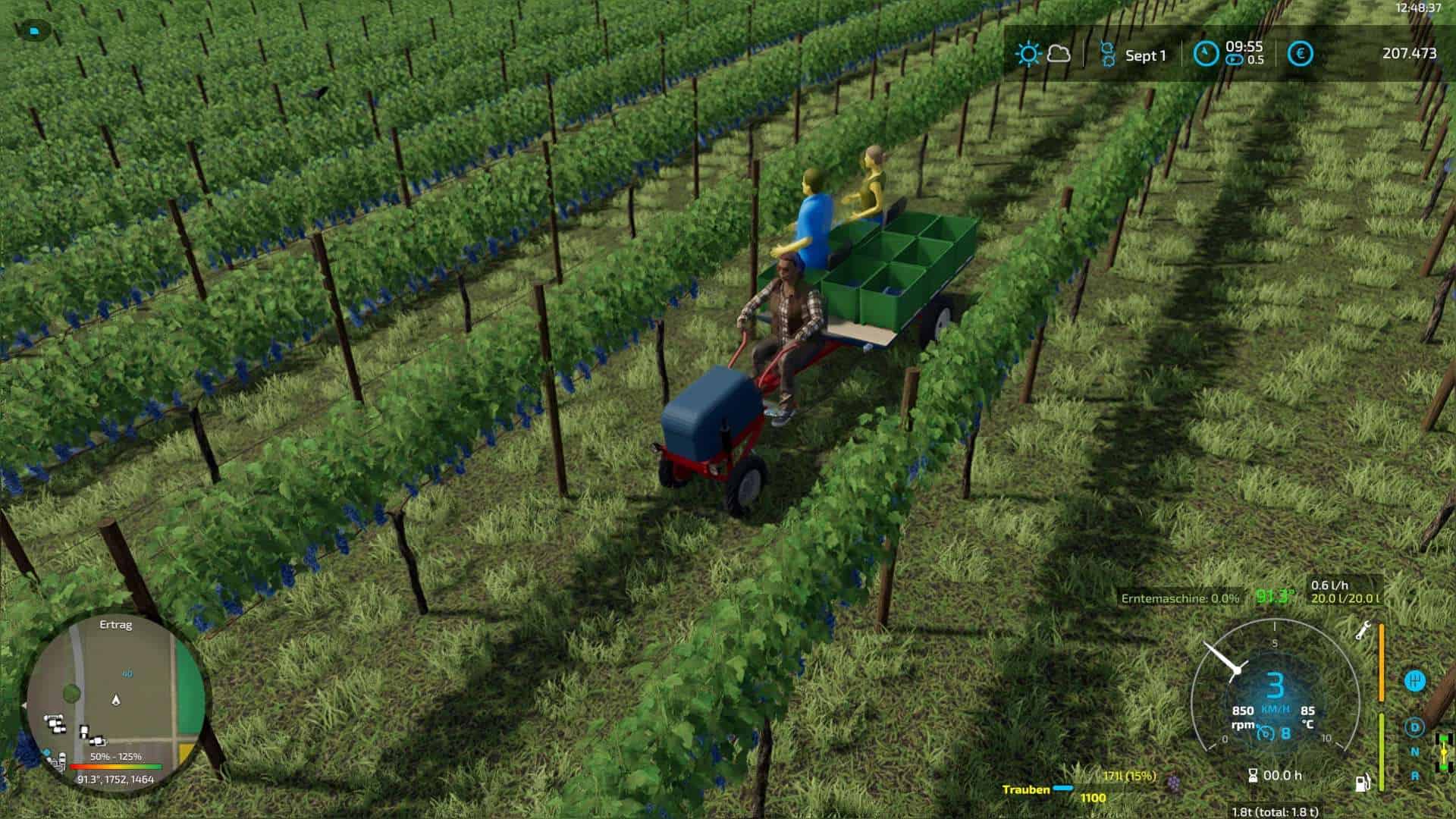 Tractor and trailer are firmly connected to each other and thus form a vehicle with articulated steering. After it has been unfolded, two figures appear who, so to speak, harvest the grapes “by hand”. The harvested grapes can then be transferred to the pallets available in the shop.