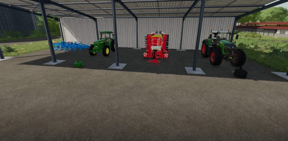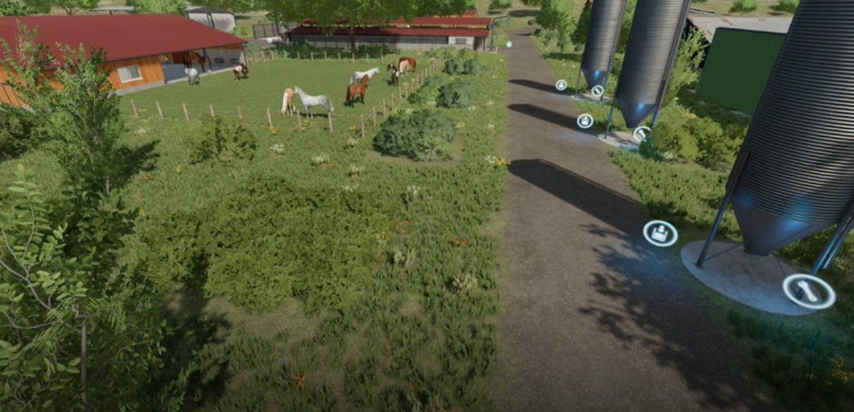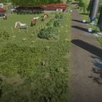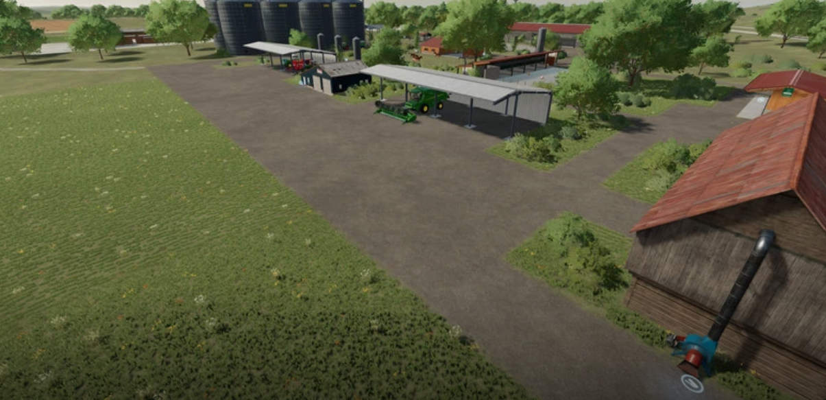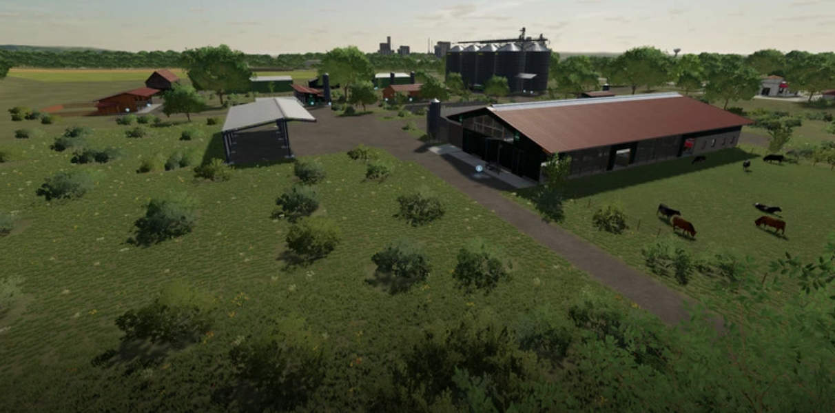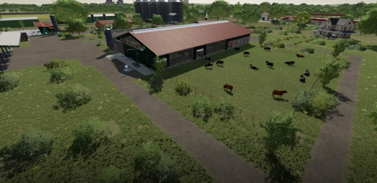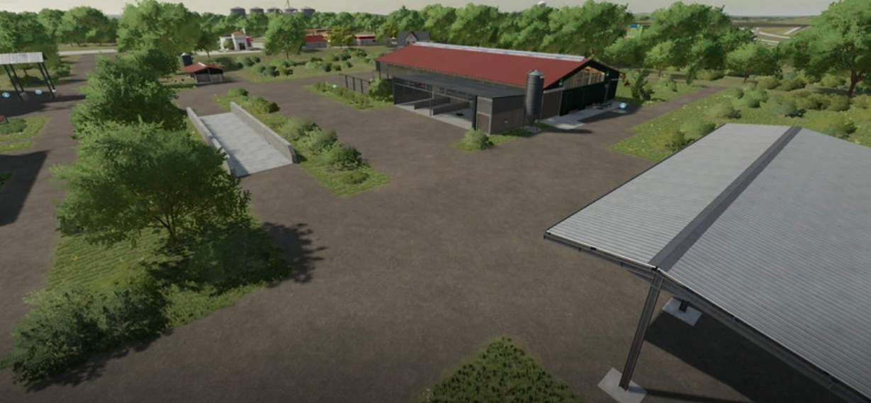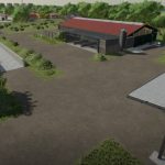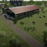 A new, large farm has been created, all types of animals are now present on the farm, as well as a few shelters, a driving silo and a straw/hay storage. At the start you own 2 fields, which are near the farm. The yard still offers enough space to use placeable objects. There is also a workshop already at the courtyard.