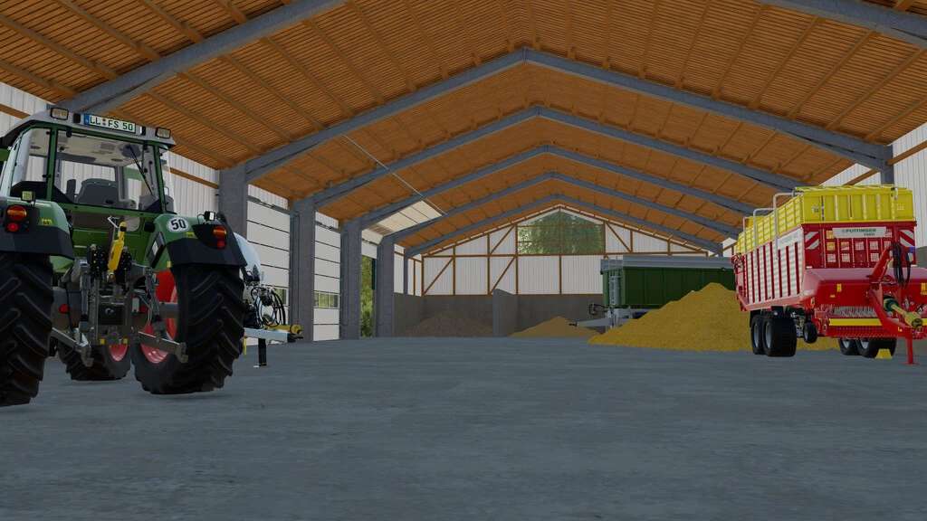 Three bulk material places at which grain, but also before the harvest, machines can be parked. These three bulk areas are separated by solid concrete walls, which are the same as the foundations of the hall.
